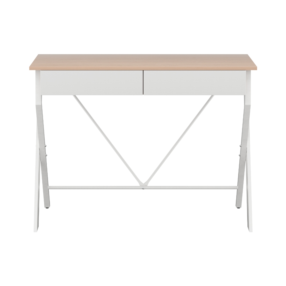 This computer desk features a durable and easy-to-maintain tabletop made from thick particle board with a melamine veneer finish. It includes two spacious storage drawers with concealed handles, providing ample space for work essentials. The sturdy U-shaped steel frame with an X-brace design ensures stability and robustness, making it suitable for various work environments.