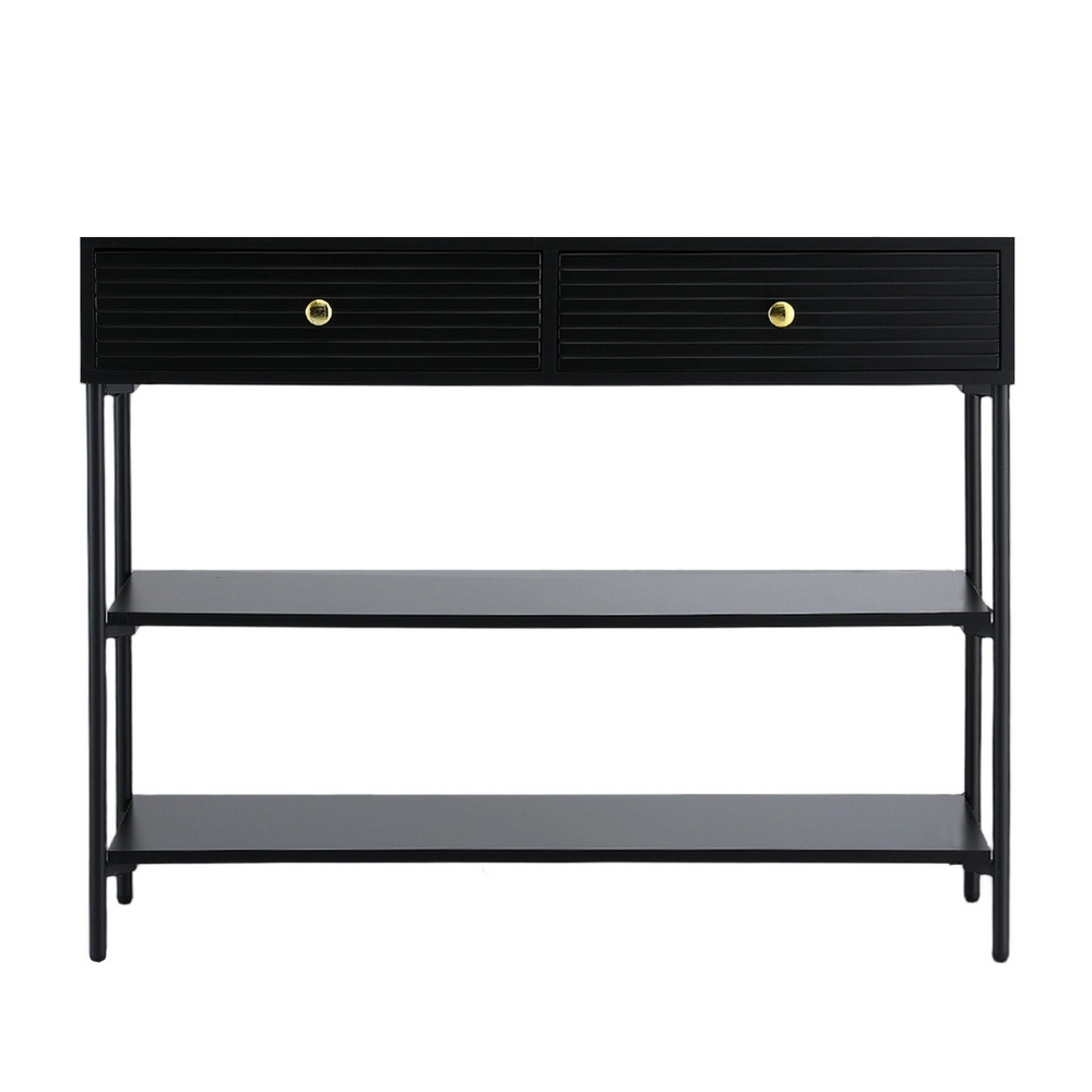 The console table combines minimalist design with practical storage solutions. It features open shelves and spacious drawers, making it suitable for organizing various essentials. Designed for durability and safety, it includes anti-toppling devices and floor protectors. Its sleek appearance makes it ideal for modern interiors in homes, offices, or commercial spaces.
