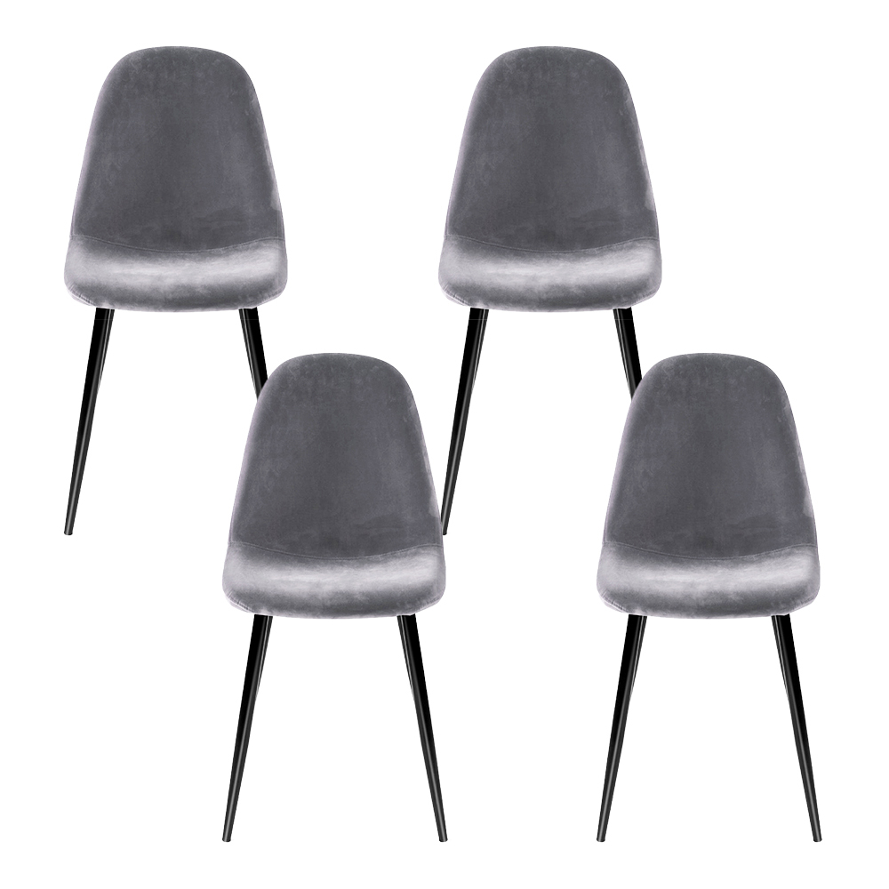 This set includes four modern dining chairs designed to enhance the look of your dining space. Crafted with soft velvet upholstery and featuring a wide, comfortable seat, these chairs combine style with comfort. The sturdy iron legs and quality fixings ensure durability, while the neutral grey color easily matches various interior decors. Additionally, each chair is equipped with anti-slip floor protectors to safeguard your flooring and provide stability during use.