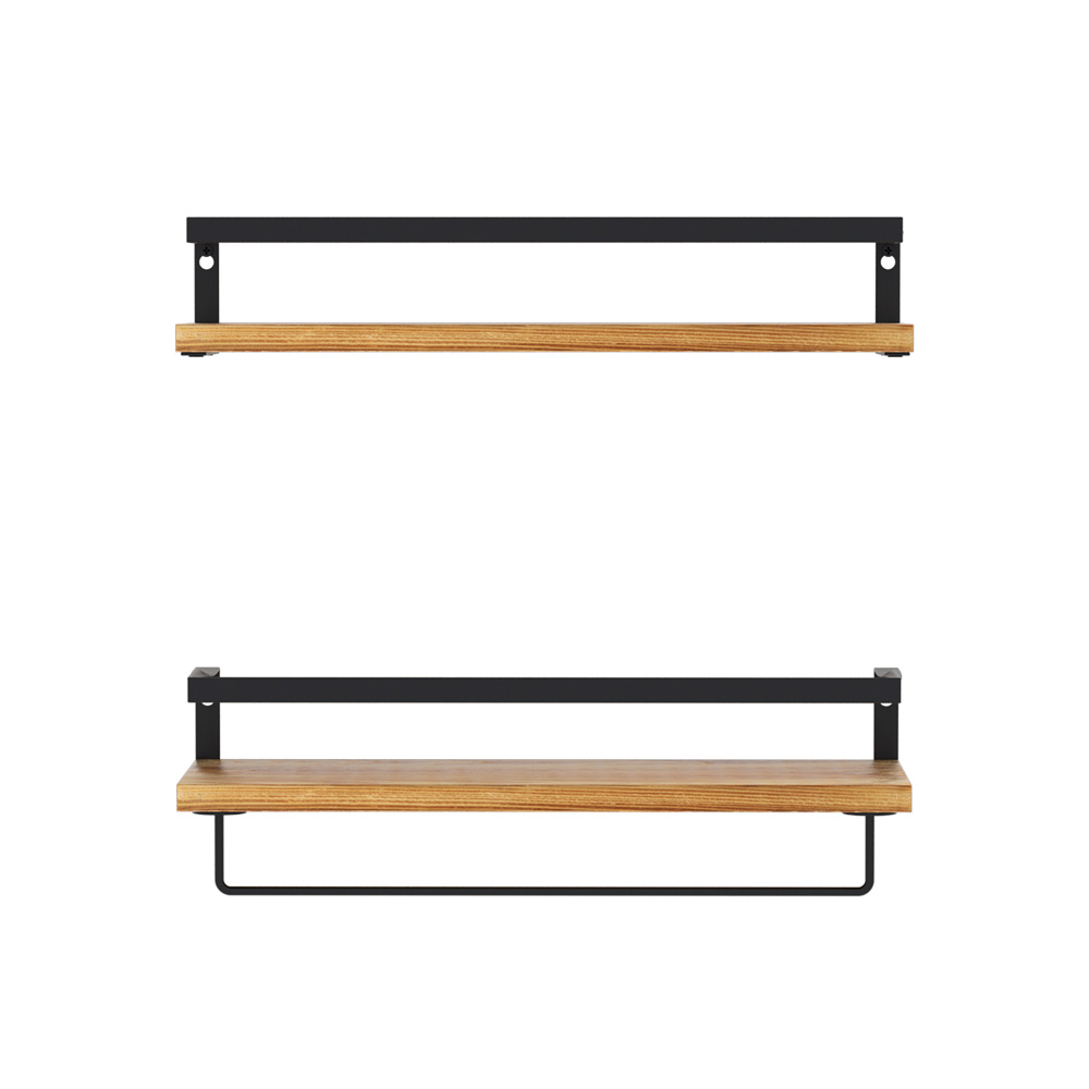 This set of two floating wall shelves offers practical storage and stylish display options for various rooms in your home. Made from smooth, solid pine wood with powder-coated metal brackets, these shelves are easy to install and versatile for different wall types. The included removable towel bar provides additional hanging space, making them suitable for bedrooms, bathrooms, kitchens, or living rooms.