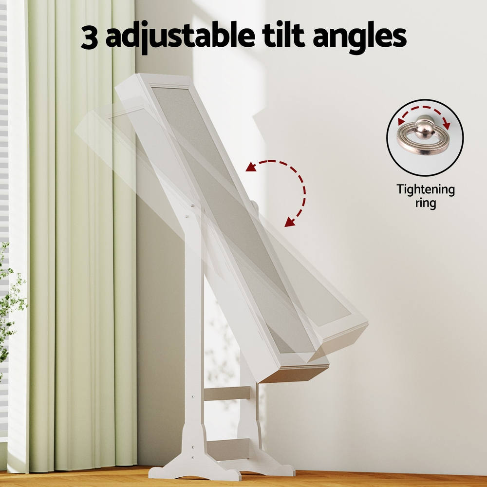 This jewellery cabinet features a full-length mirror and is constructed from durable MDF. It offers ample storage space with an interior LED light and soft flocking lining to protect your jewelry. The cabinet is designed for easy assembly and includes a lock for security. Its triangular base provides stability, making it a practical addition for organizing and displaying jewelry collections.