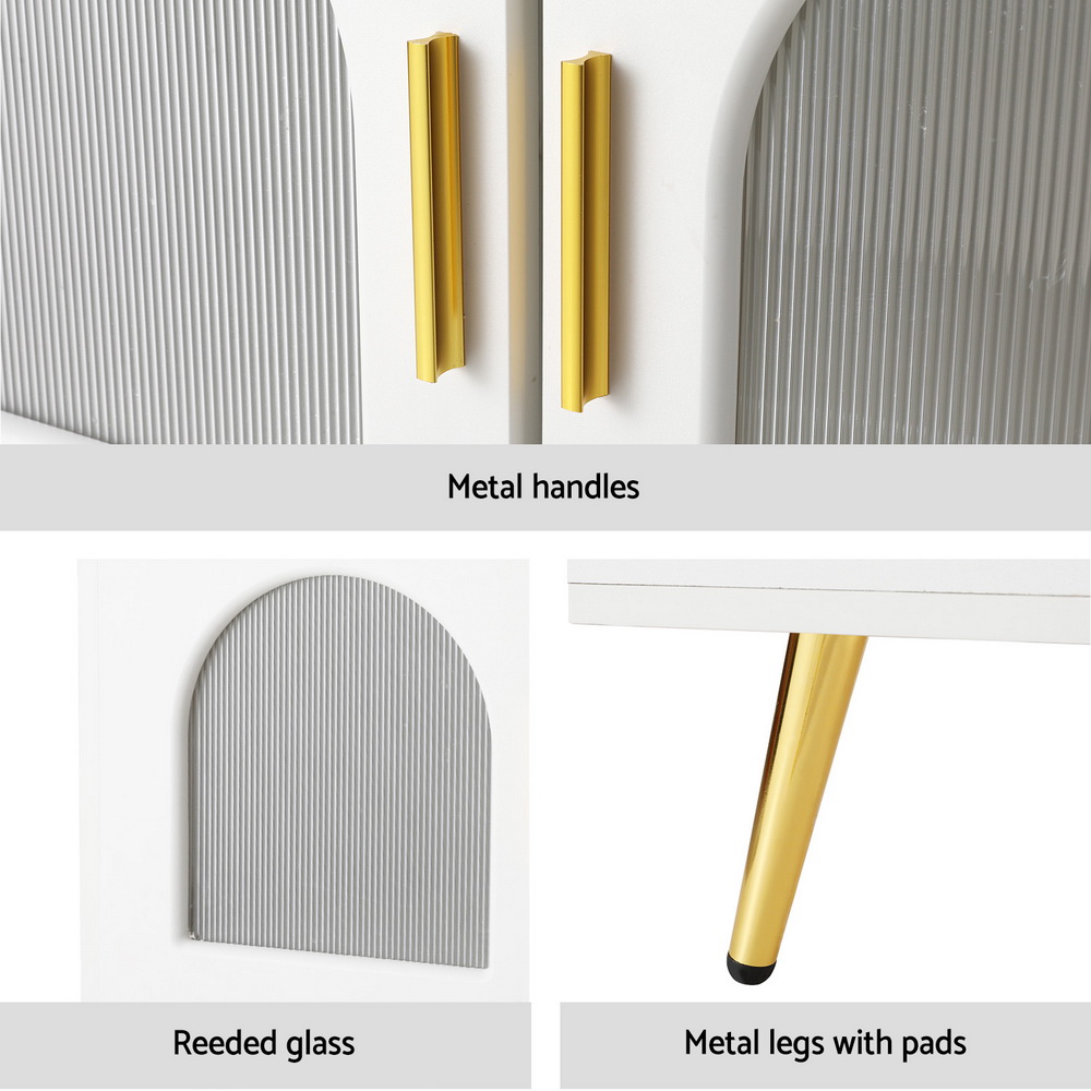 This contemporary coffee table features integrated LED lighting, USB connectivity, and ample storage options. Its sleek design includes metal handles, a melamine-coated particle board surface, a reeded acrylic glass door, electroplated metal legs, and smooth runners, combining modern functionality with stylish aesthetics.