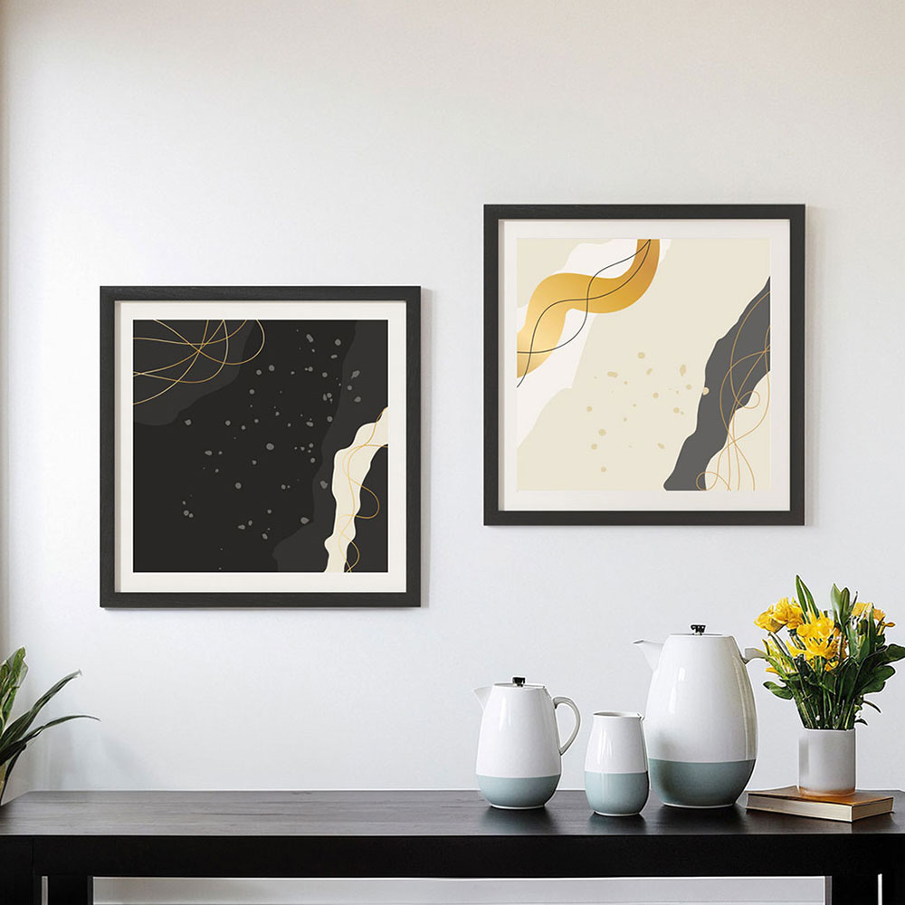 This set includes two photo frames designed to display 16 inches by 16 inches prints. The frames are constructed from MDF with a smooth finish and feature polystyrene glass for clear viewing. They are suitable for wall mounting in both portrait and landscape orientations, providing an elegant way to showcase your photos.