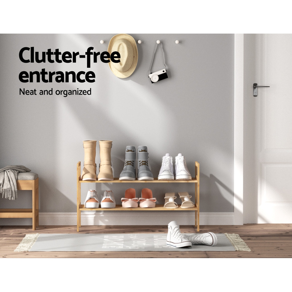 This shoe rack cabinet offers a practical storage solution to keep your home organized and tidy. Made from sturdy bamboo with a natural wood grain finish, it complements various interior styles. The two-tier open shelves provide ample space for shoes and other essentials, with gaps to promote airflow and prevent moisture buildup. Its simple design and easy assembly make it a convenient addition to hallways or entryways.