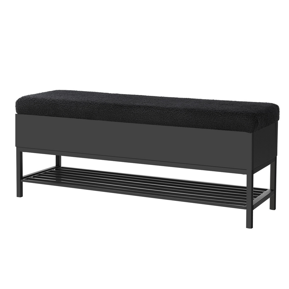 This storage ottoman features a soft boucle upholstery and a durable MDF frame, providing both comfort and stability. It offers a hidden storage compartment and an open shelf for versatile storage options. The design includes sturdy metal hinges and is easy to assemble, making it a practical addition to any space.