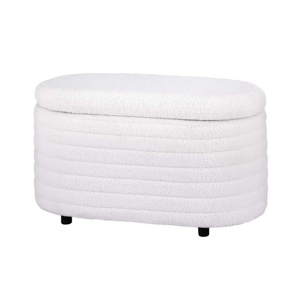 This storage ottoman combines functionality and style, making it a practical addition to any room. Upholstered in soft boucle fabric, it features a padded top that provides comfortable seating. The hinged lid allows easy access to the storage space inside, which is suitable for storing blankets, books, or toys. Its compact and versatile design makes it ideal for small spaces, enhancing decor while offering convenient storage.