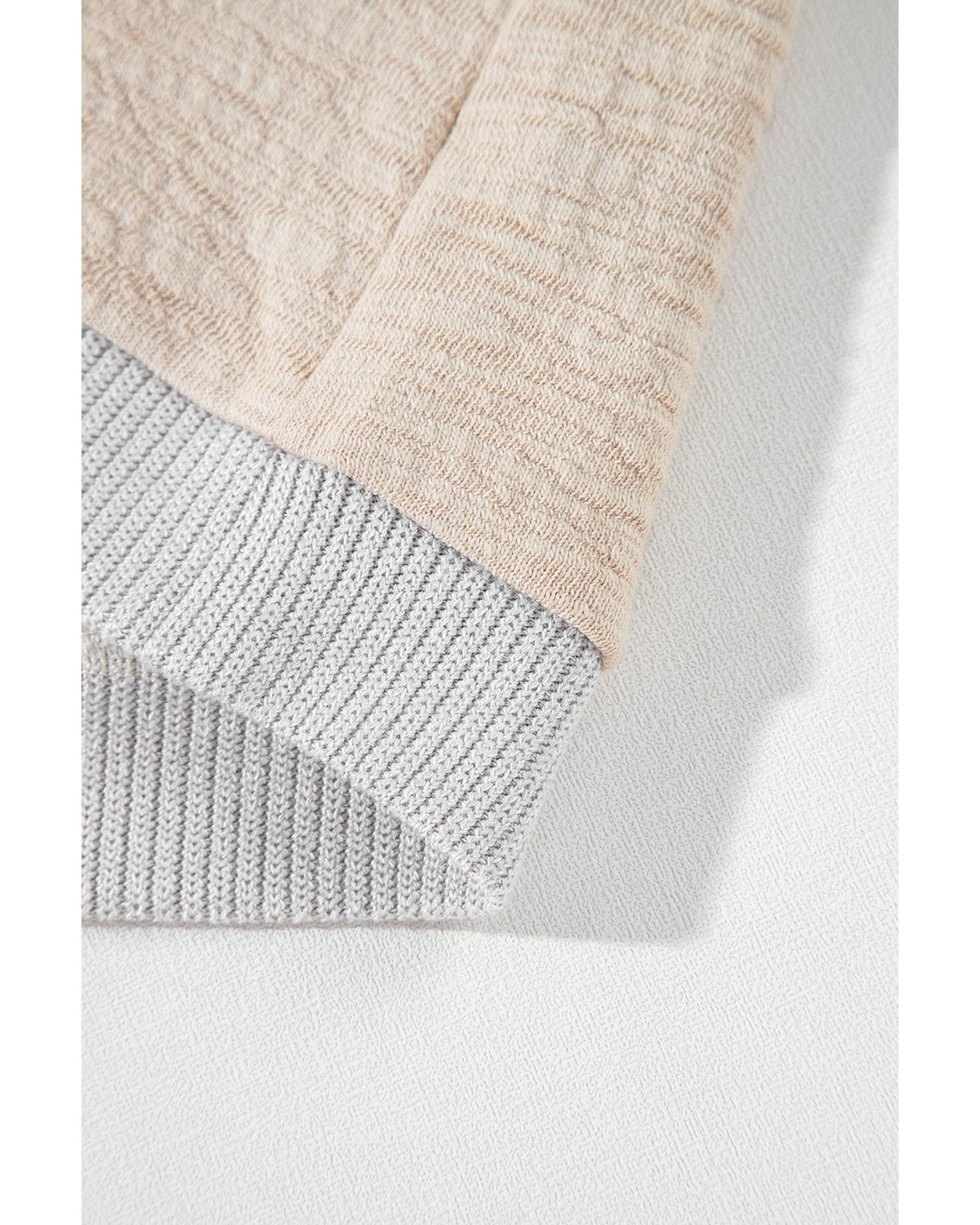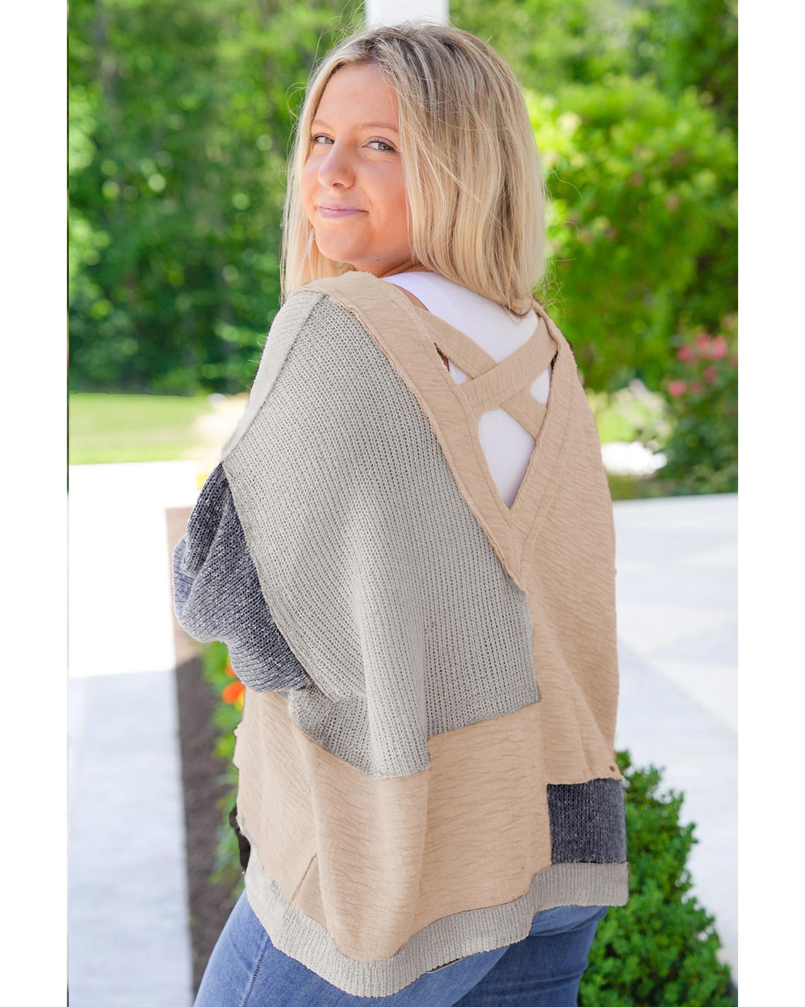 - Features a textured colorblock patchwork design with a V-neckline for a chic look