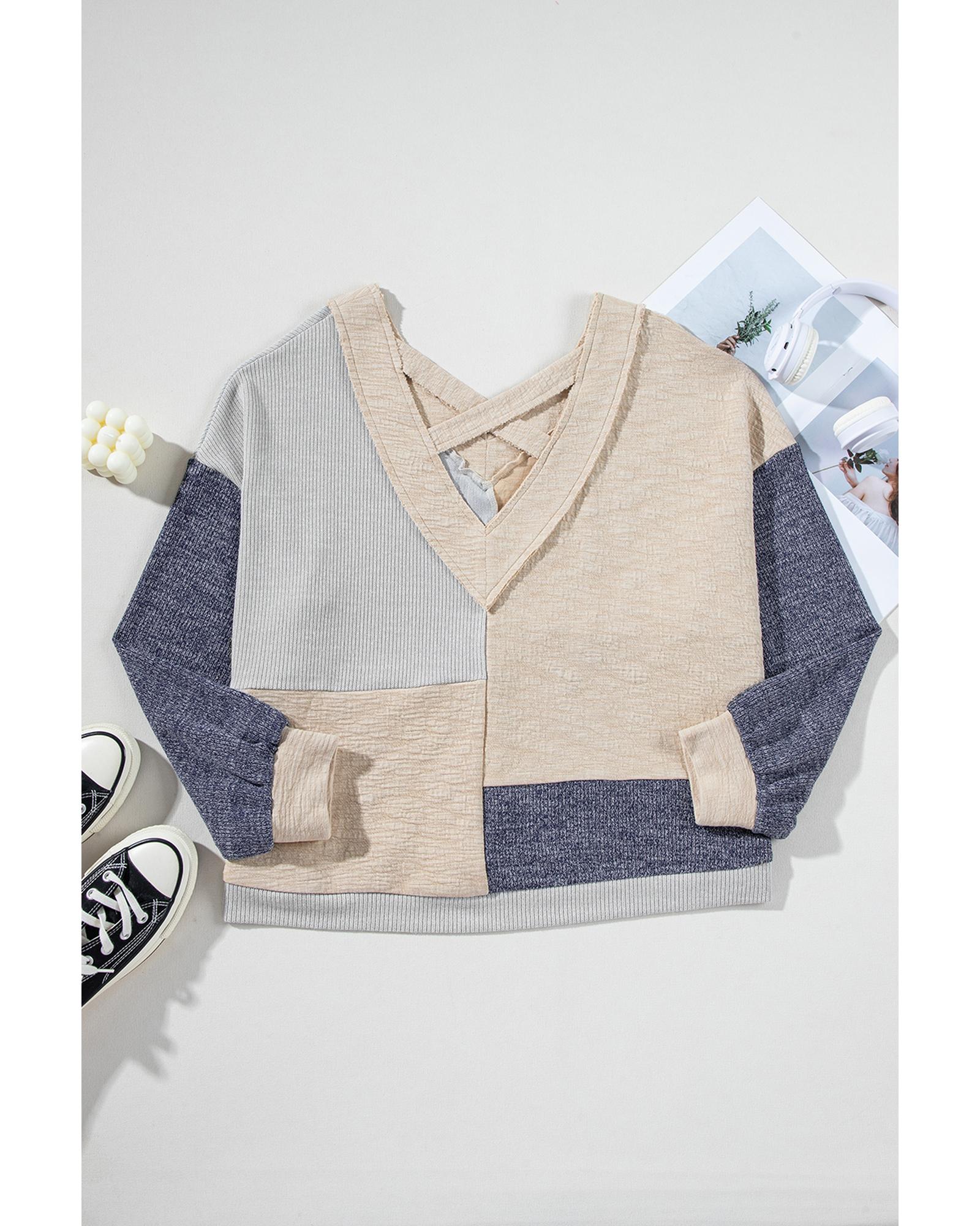 • Features a textured colorblock patchwork design with a V-neckline for a feminine touch
