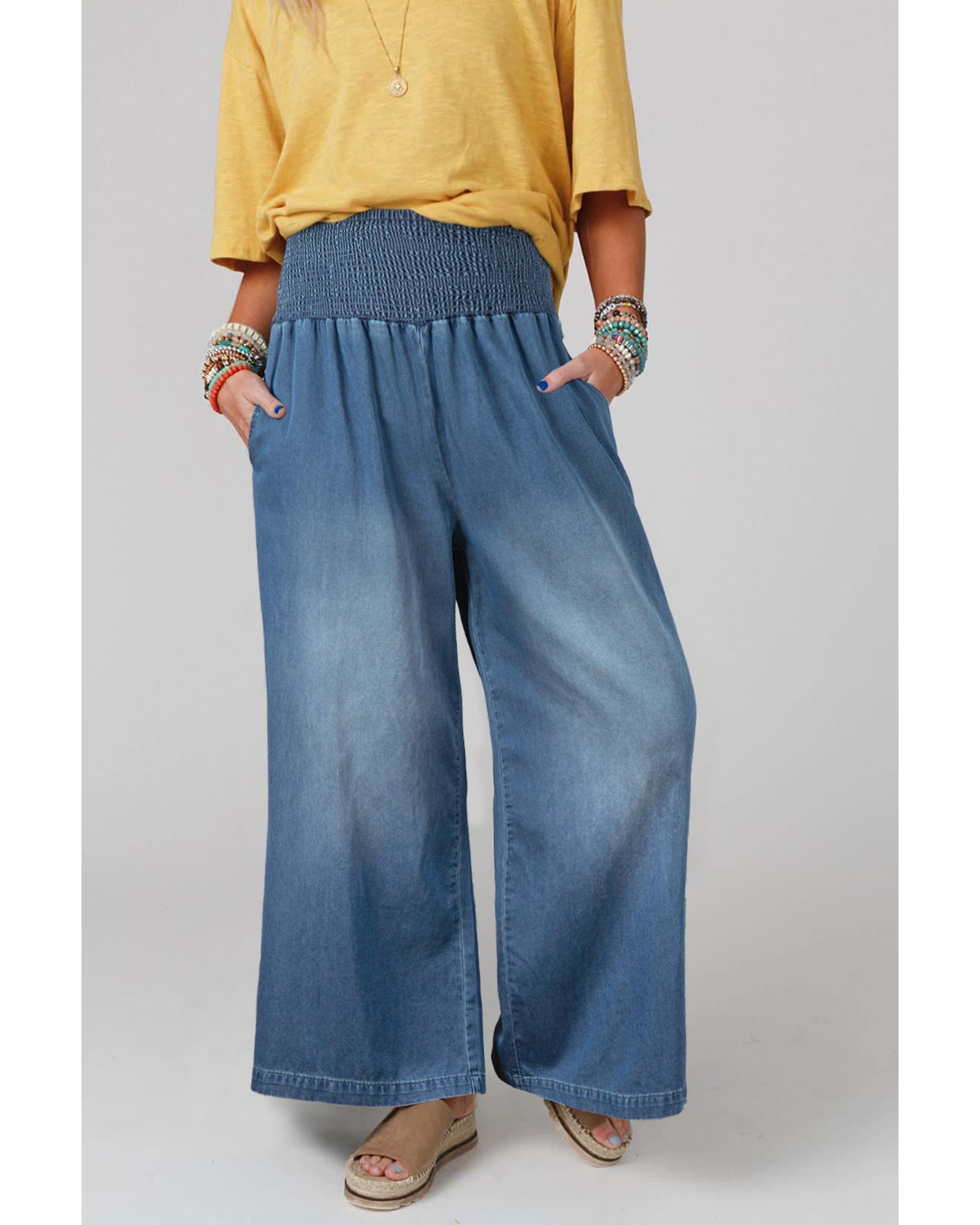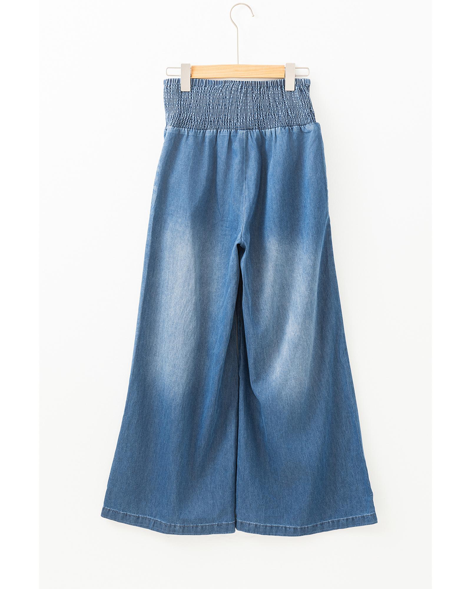 These wide-leg jeans feature a trendy and relaxed fit with a unique smocked waist detail for added comfort. Crafted from durable denim, they offer a classic look suitable for various casual occasions. Designed with a fashionable silhouette, these jeans are available in multiple sizes to ensure a perfect fit.
