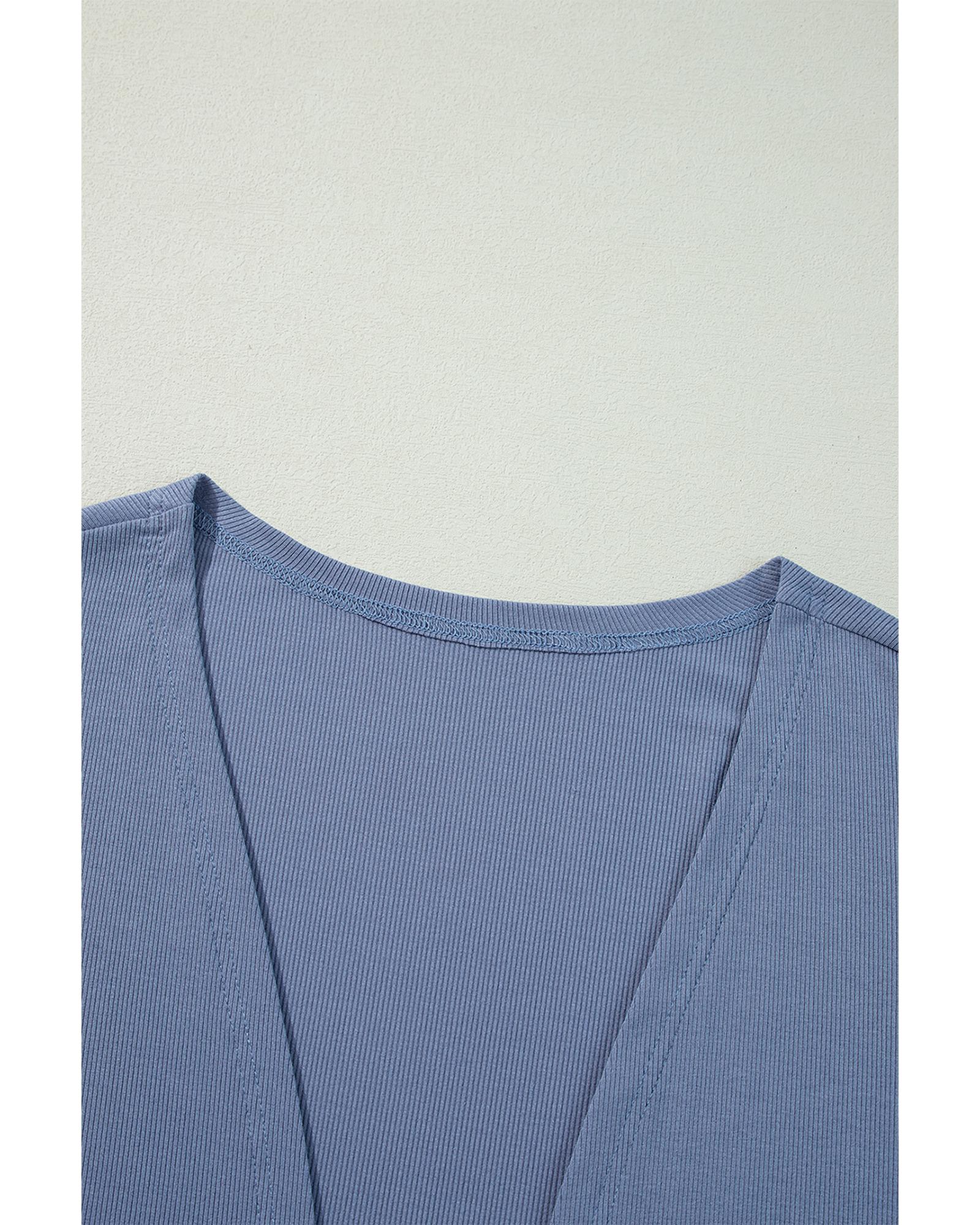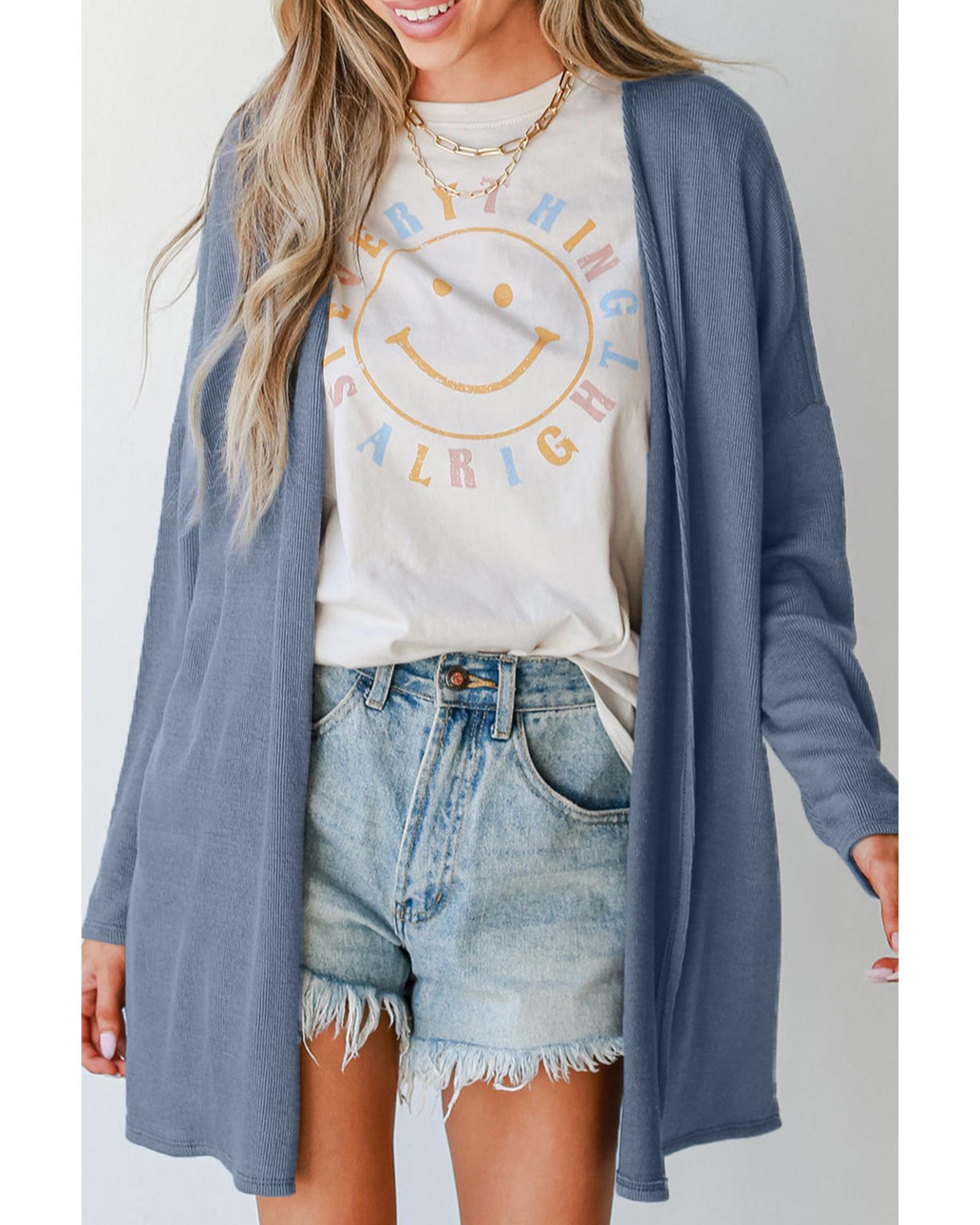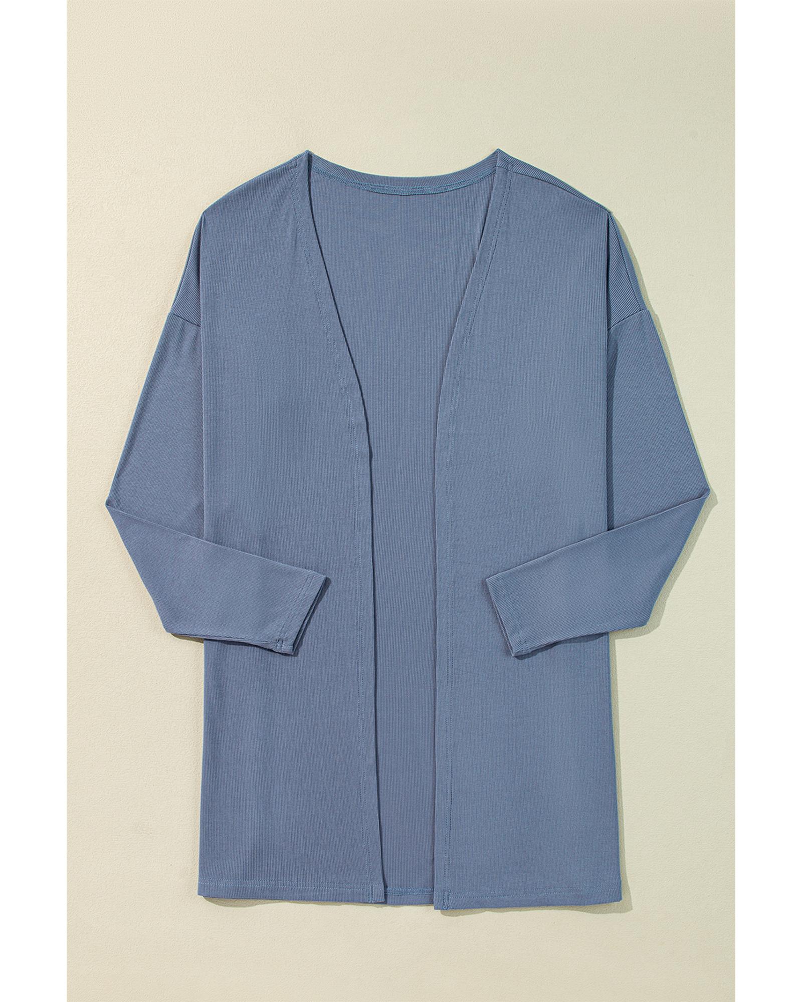 This open front tunic cardigan features a solid color rib knit design, offering a timeless and versatile layering piece suitable for various occasions. Its lightweight and comfortable fit make it ideal for transitional weather or indoor lounging, easily pairing with different outfits for a stylish look.