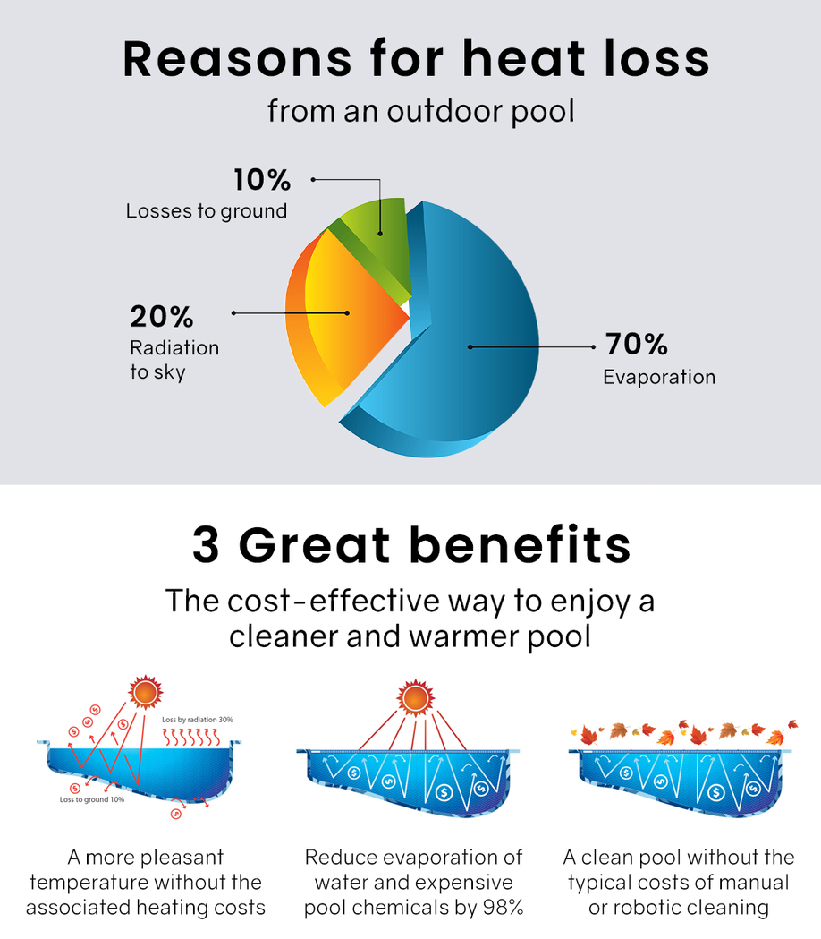 This pool cover is designed to reduce water evaporation, conserve chemicals, and keep debris out of your pool. It features a durable construction suitable for various weather conditions, providing an effective thermal barrier and enhancing pool maintenance efficiency.