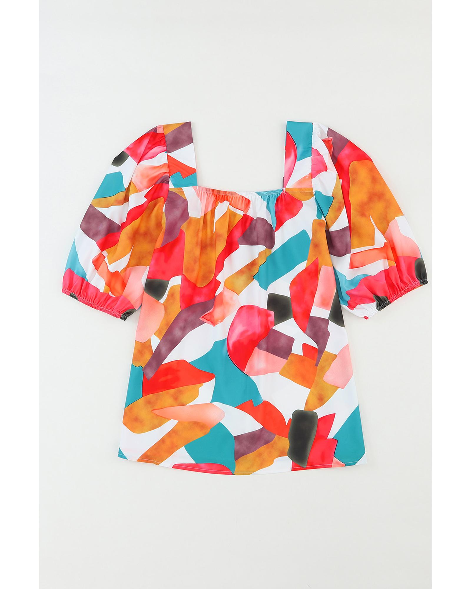 This blouse features a vibrant abstract print and a stylish square neckline, making it a versatile addition to any wardrobe. Designed with short sleeves, it offers a comfortable fit suitable for various occasions, whether casual or formal. Crafted for women, this top combines artistic flair with everyday practicality.