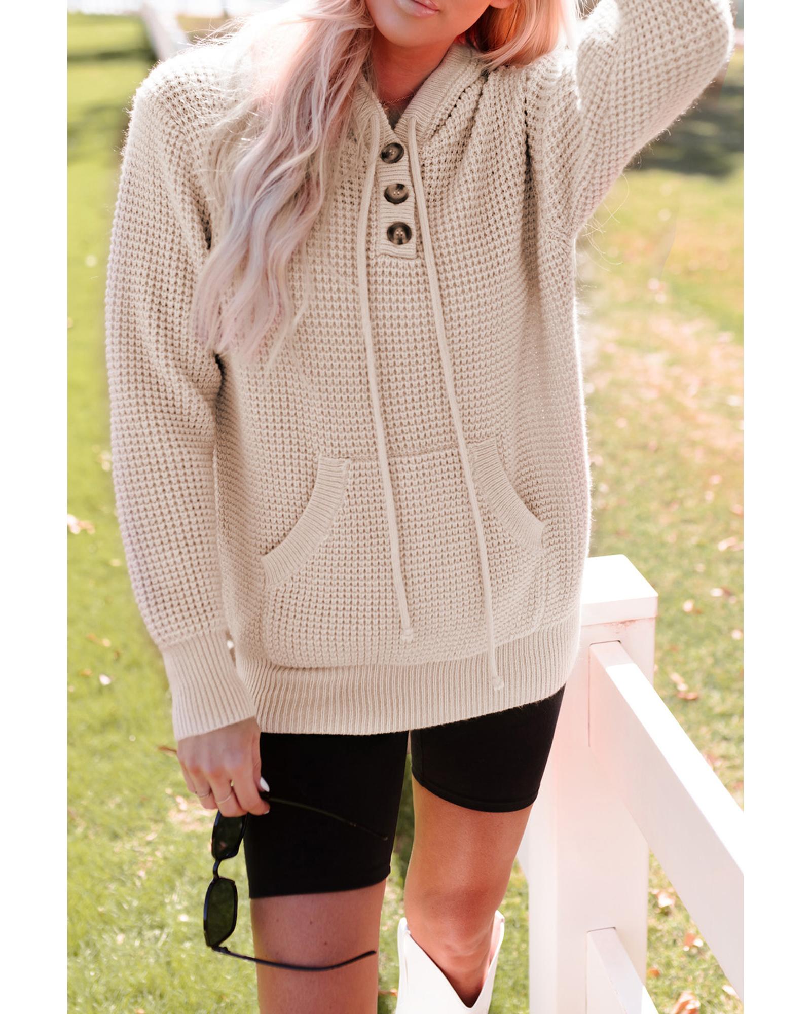 Azura Exchange Apricot Waffle Knit Buttons Hooded Sweater with Pocket – L