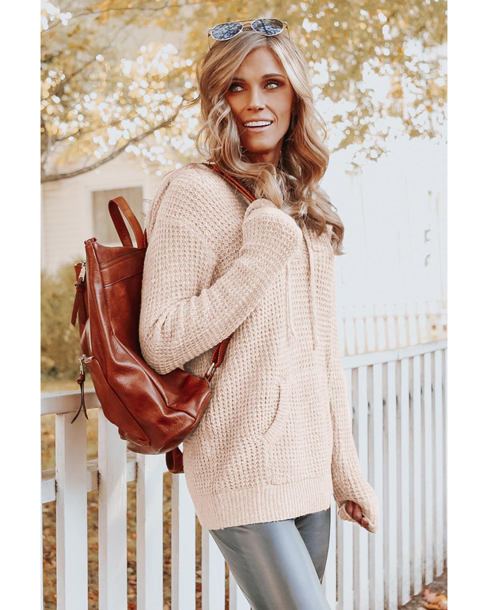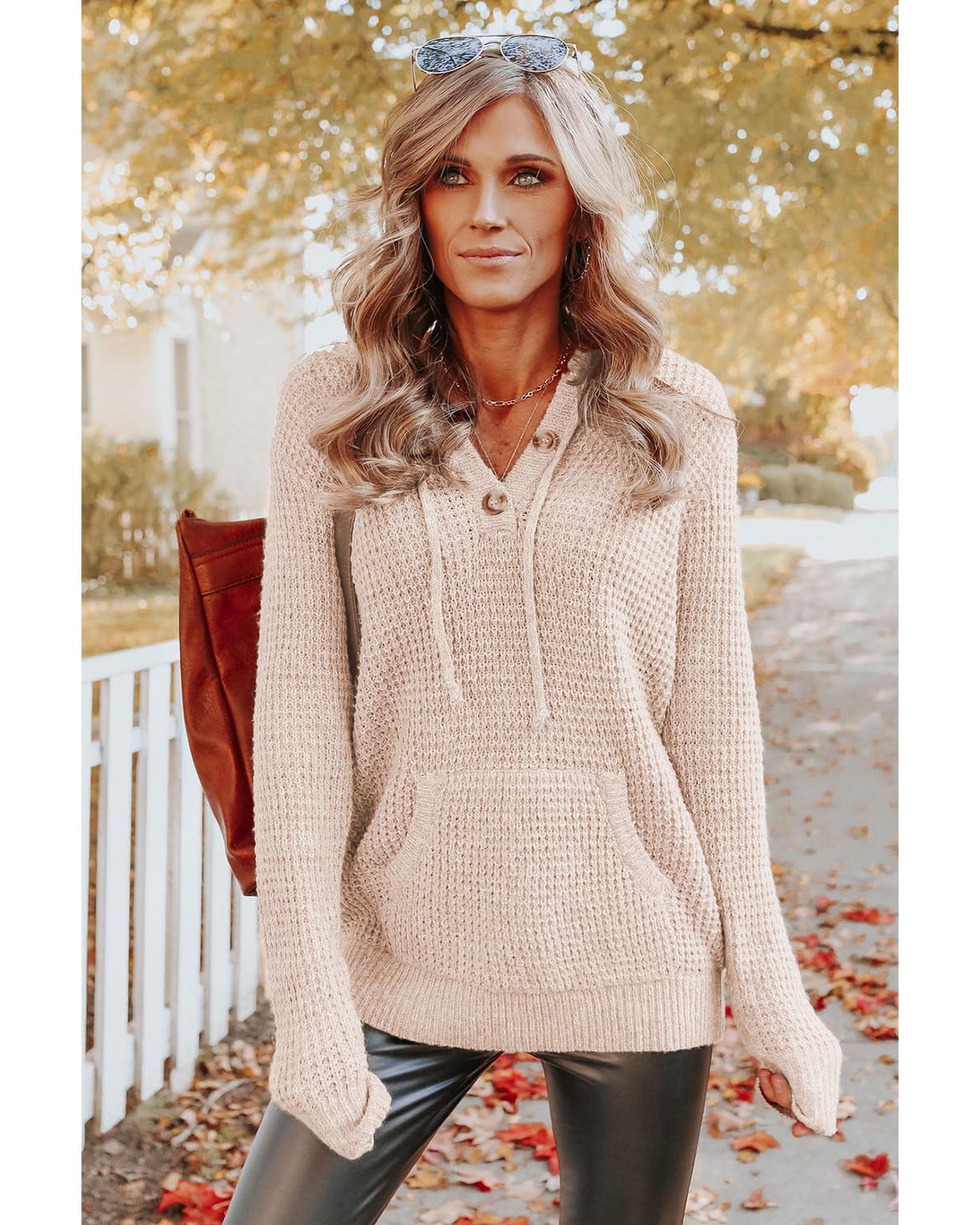 This apricot waffle knit hooded sweater features a buttoned neckline and a kangaroo pocket, offering a casual and comfortable style. Made from soft, lightweight, and warm knit fabric, it is suitable for various occasions including casual outings, travel, home, dates, parties, work, and shopping. An essential addition to your winter wardrobe.