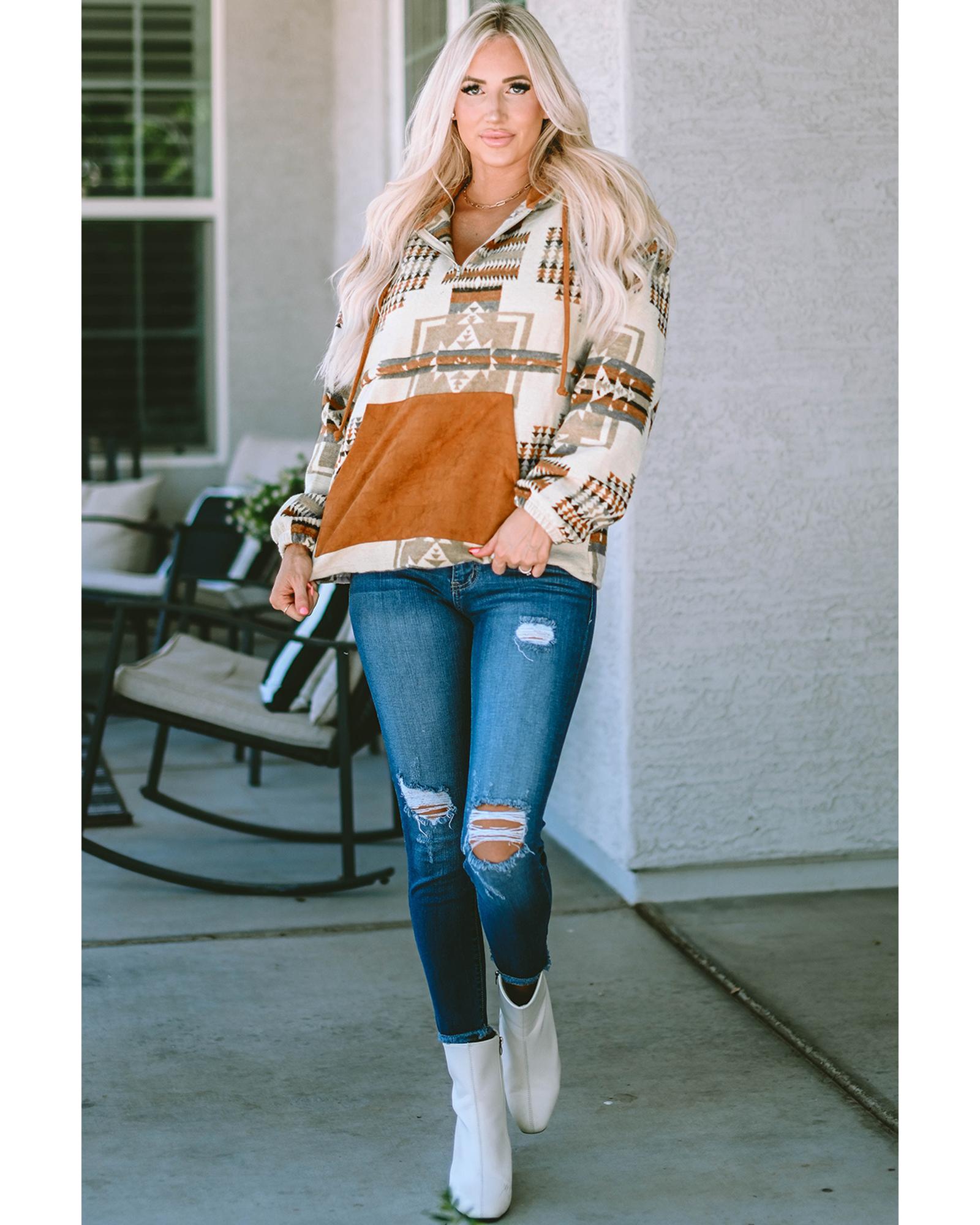 Azura Exchange Beige Aztec Print Half-Zip Hoodie with Kangaroo Pocket – M