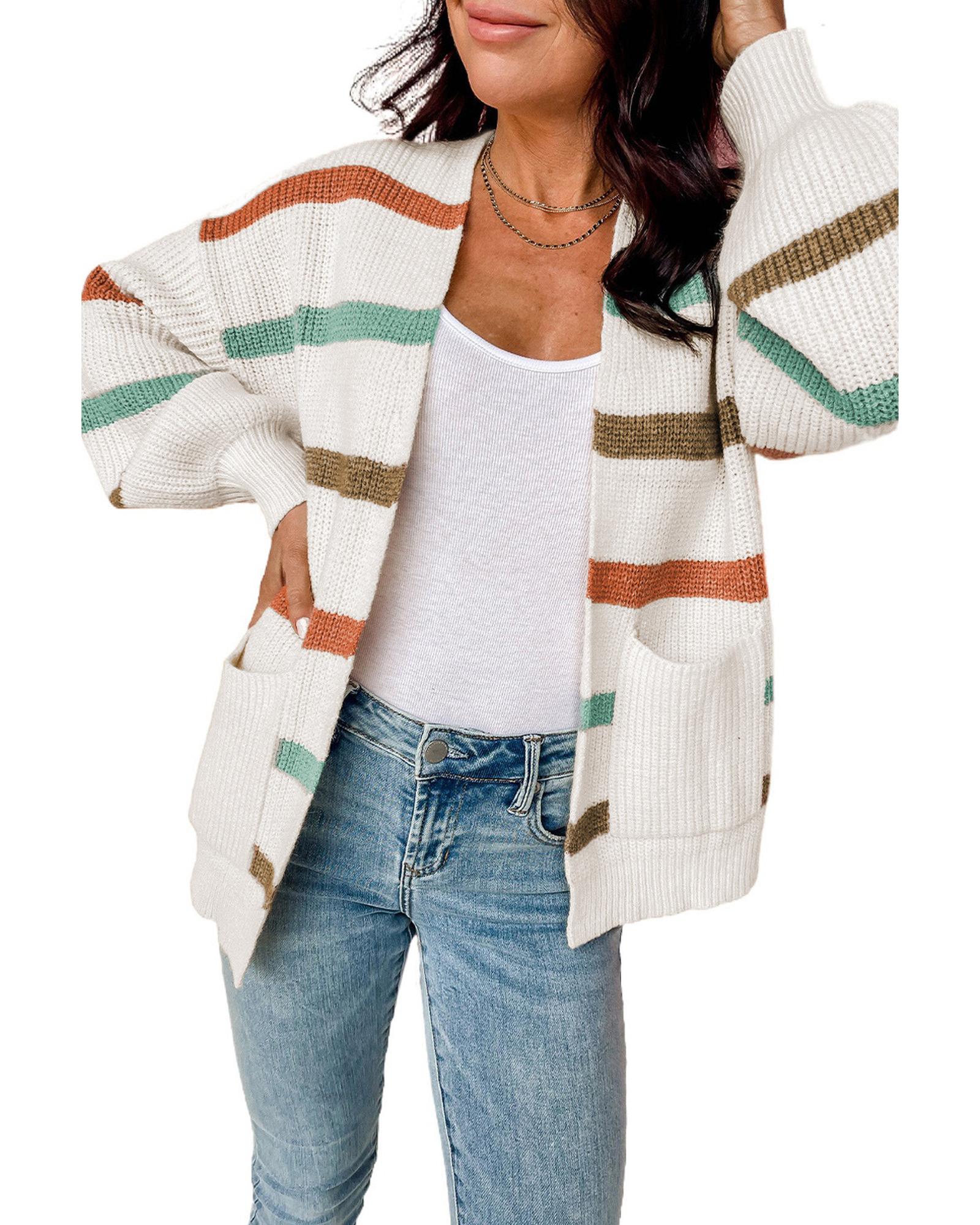 This drop shoulder pocketed stripe sweater cardigan offers a versatile and stylish addition to your wardrobe. Its classic triple striped pattern and open front design make it suitable for various casual and layered looks, providing both comfort and fashion.