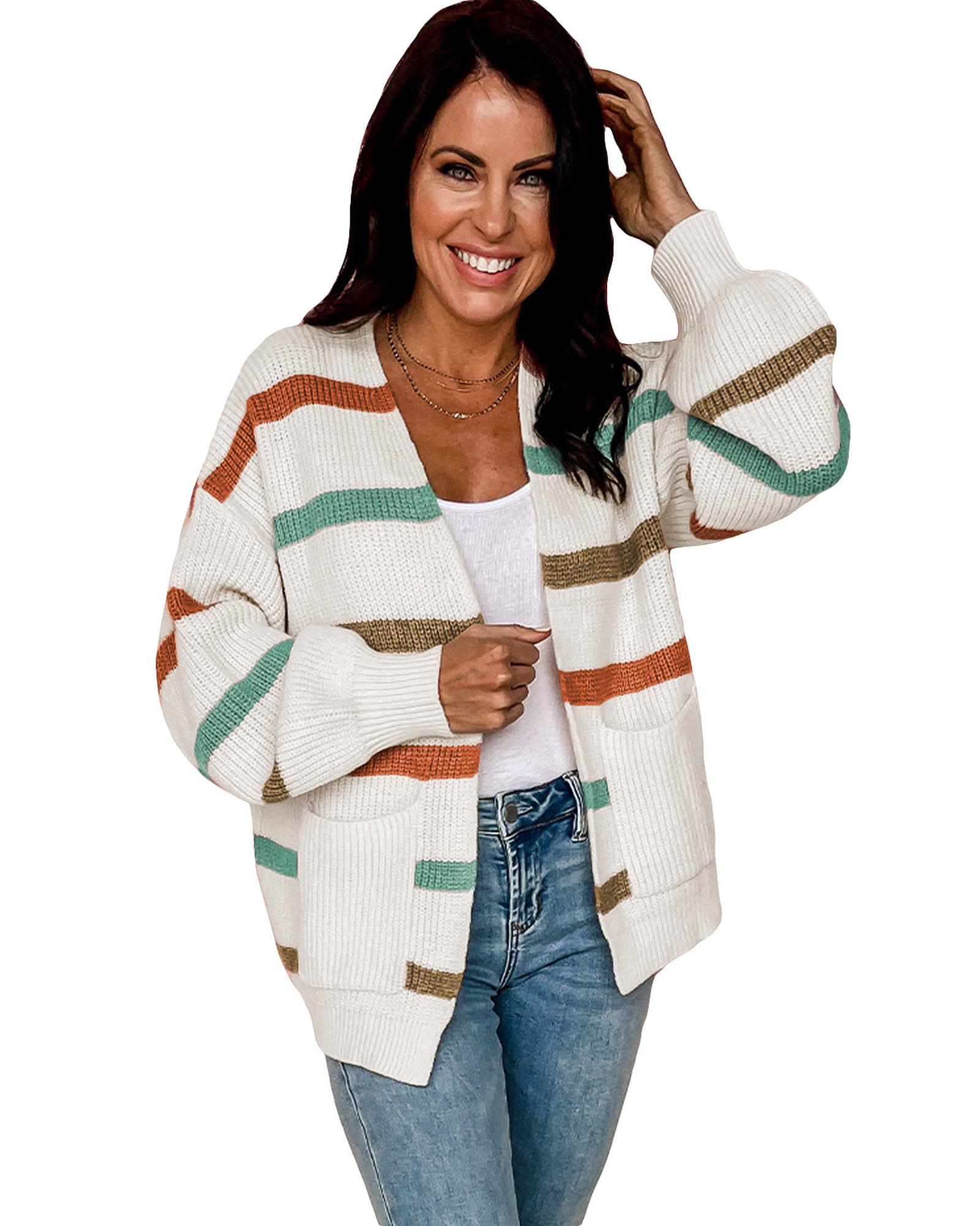 Azura Exchange Beige Drop Shoulder Pocketed Stripe Sweater Cardigan – XL