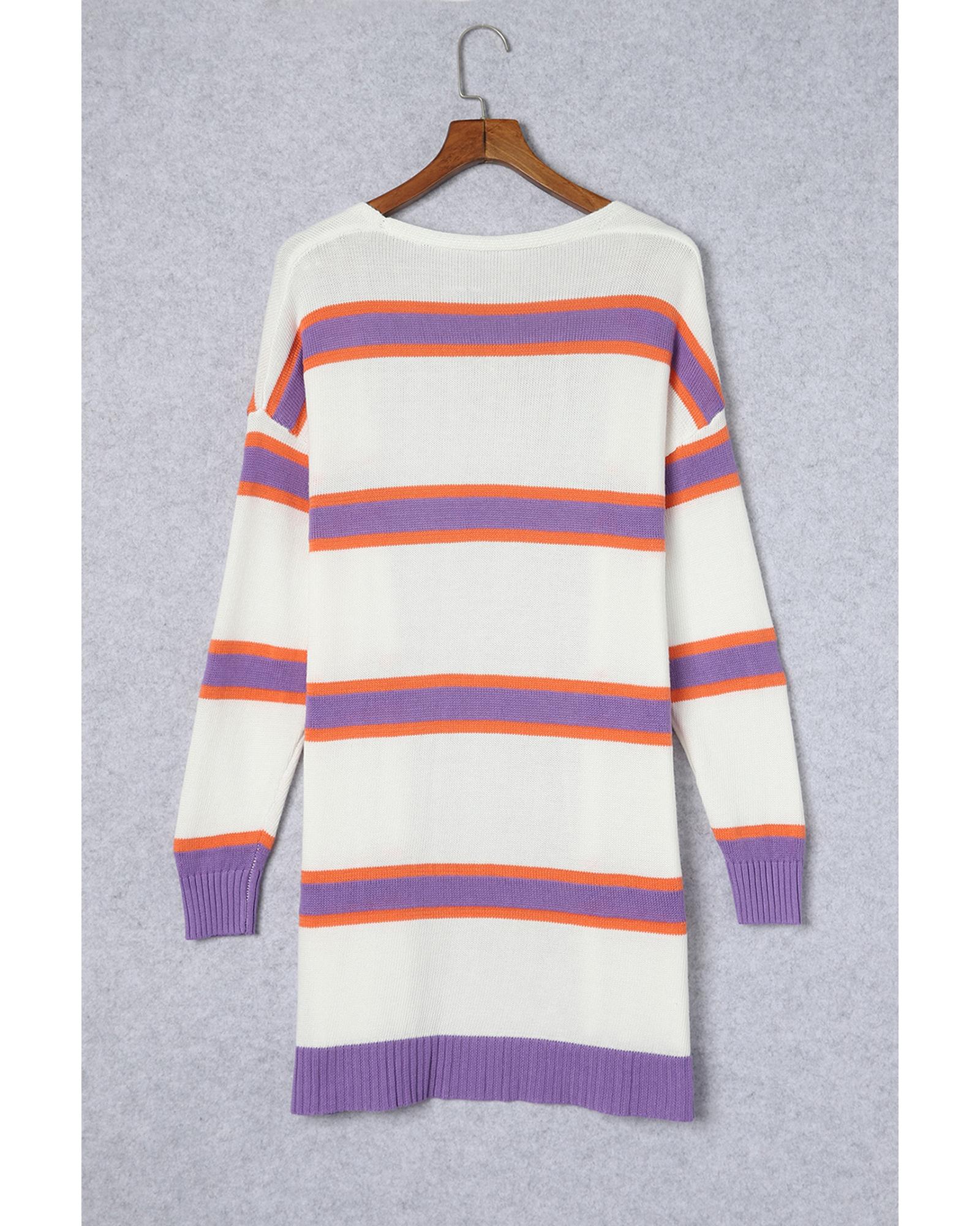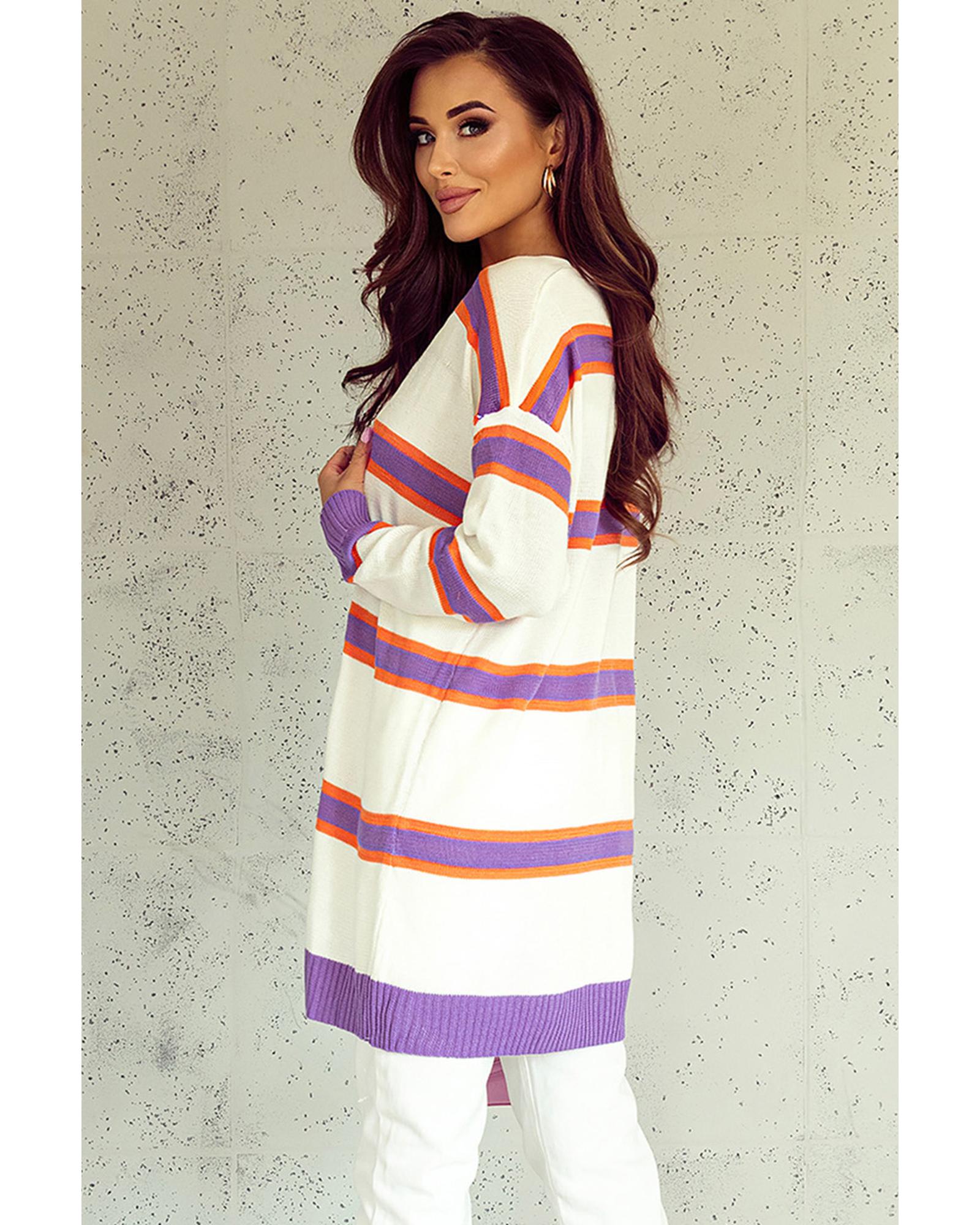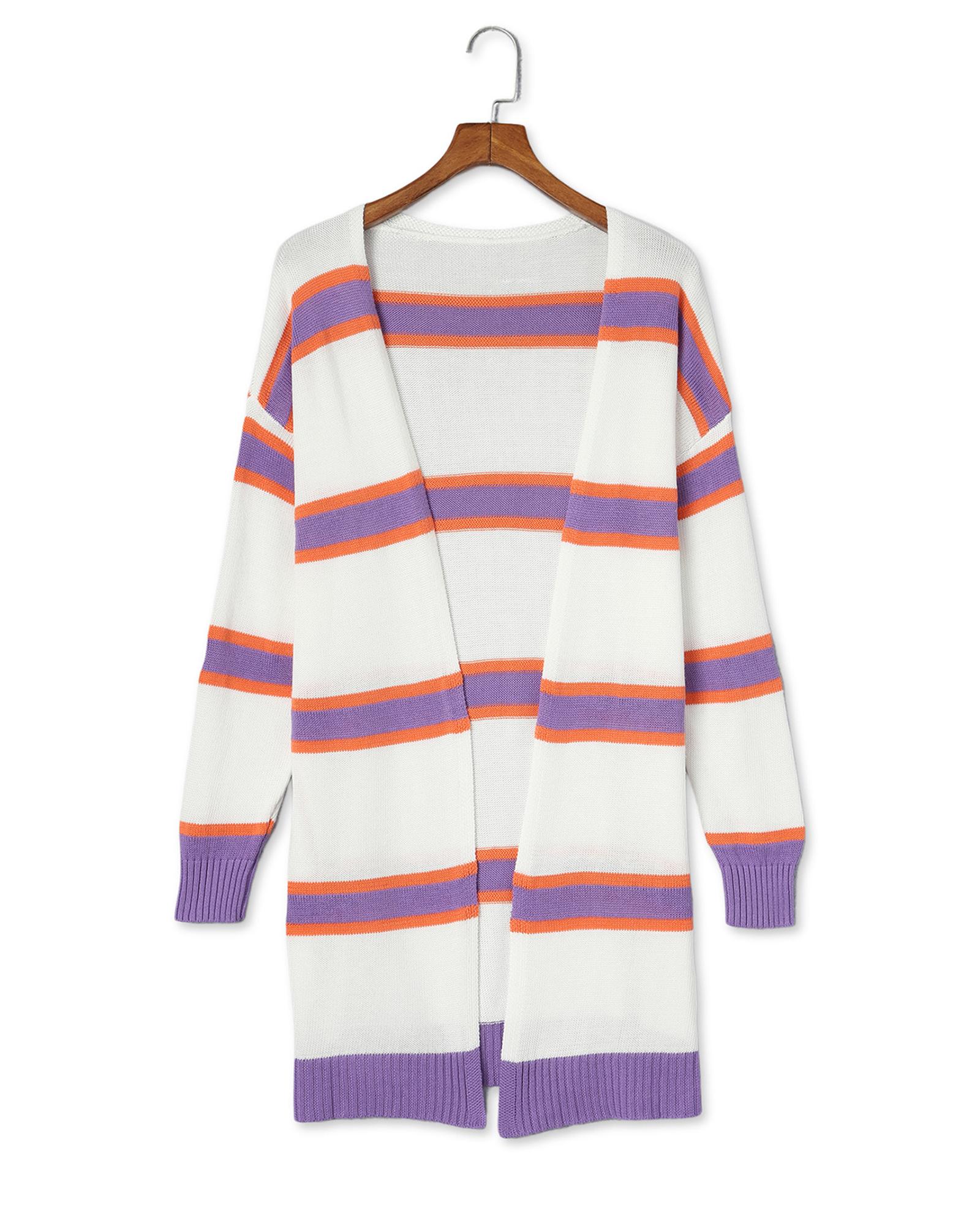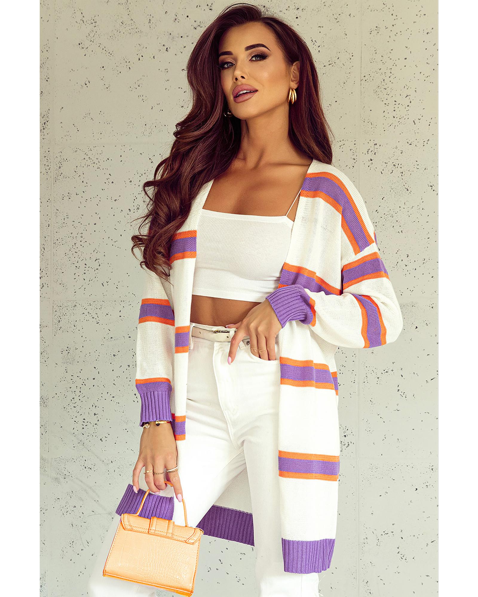 This beige striped long sleeve cardigan features a classic design with ribbed trim, offering a versatile and stylish addition to your wardrobe. Its button closure provides convenience, making it suitable for both casual and more dressed-up occasions. The long sleeves ensure warmth and comfort, perfect for various seasons.