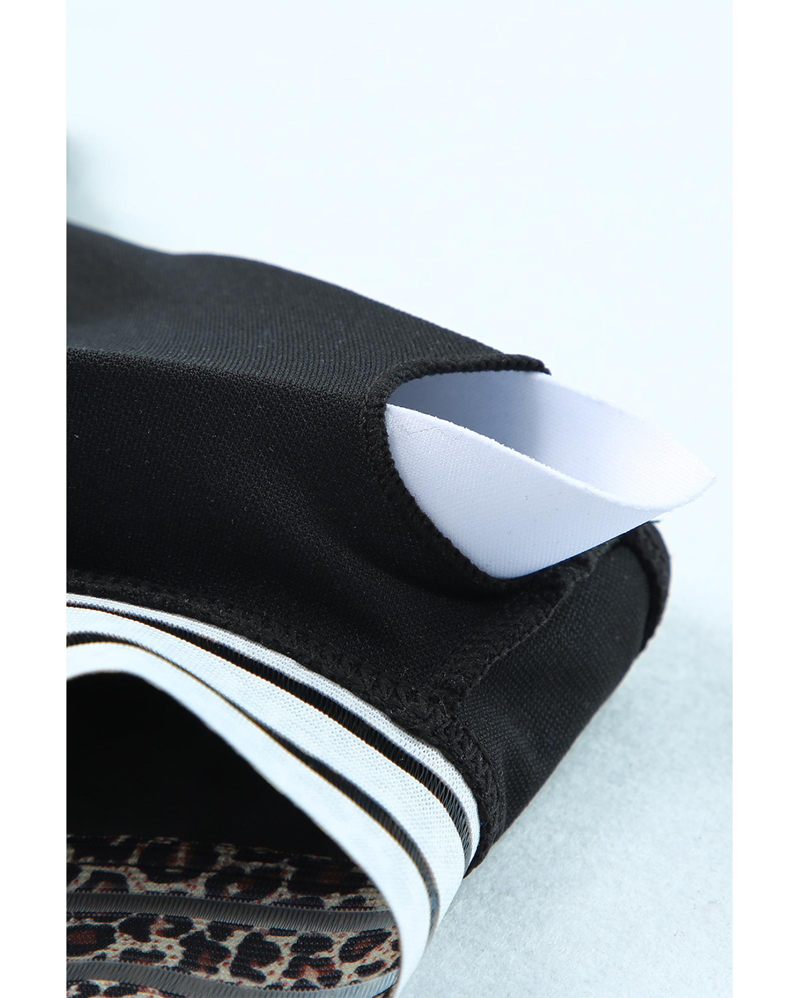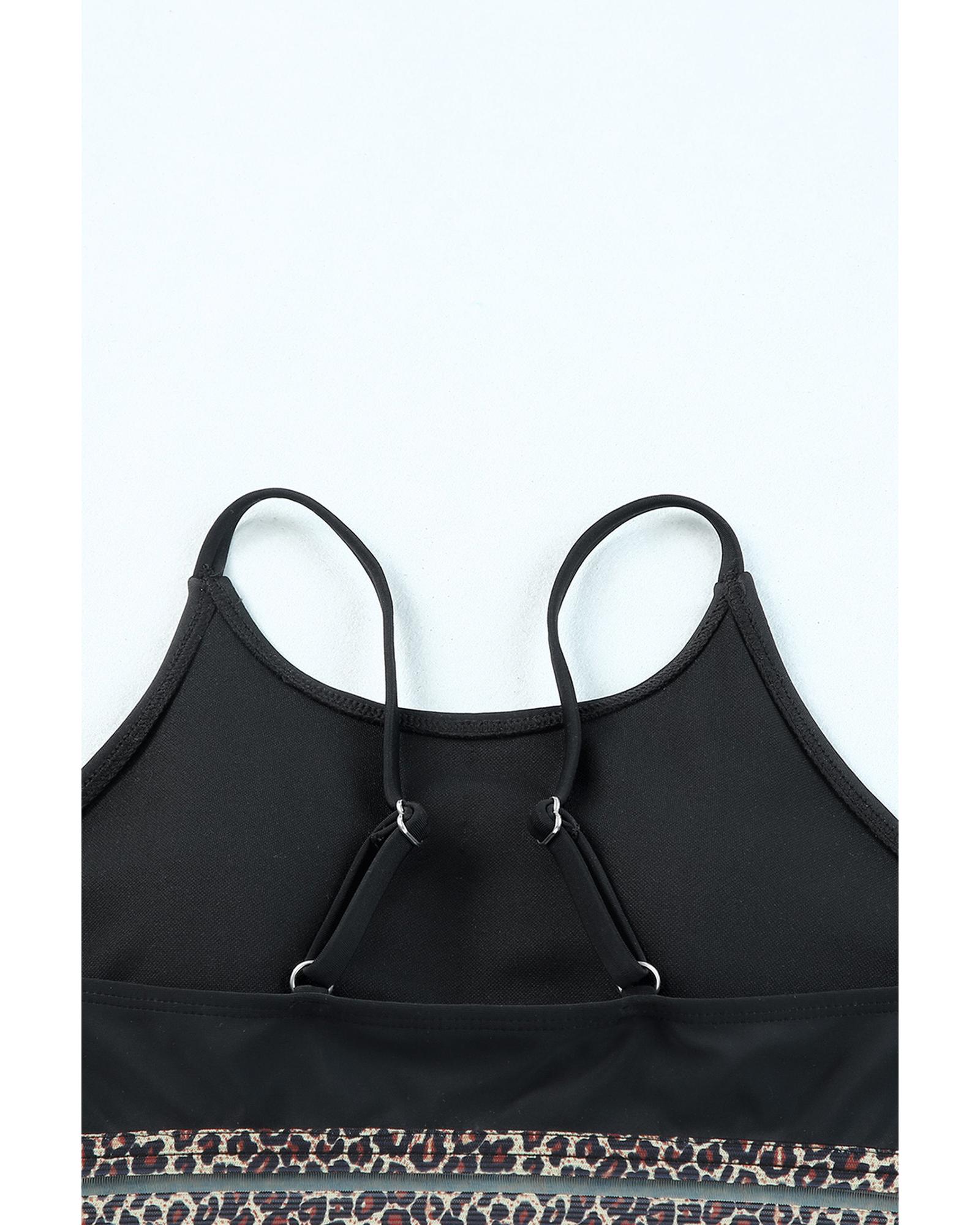 This athletic two-piece bikini set features a stylish leopard mesh trim design, combining comfort and a trendy look. It includes a scoop neck swim top and high-rise bikini bottoms, making it suitable for various water activities and beach outings.