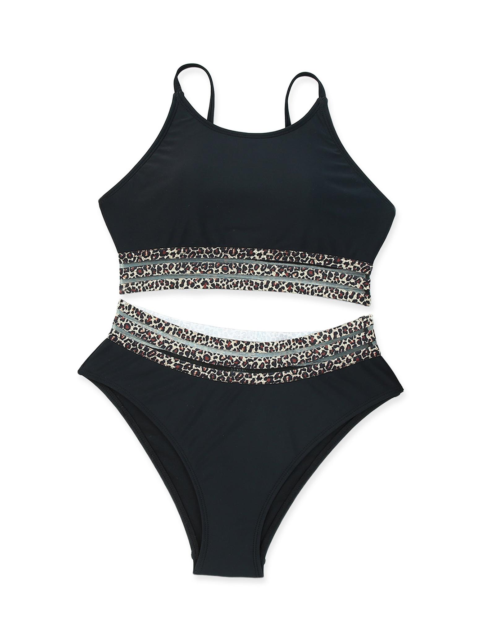 This athletic two-piece bikini set features a stylish leopard mesh trim design, combining comfort and a trendy look. It includes a scoop neck swim top and high-rise bottoms, making it suitable for various water activities and beach outings.