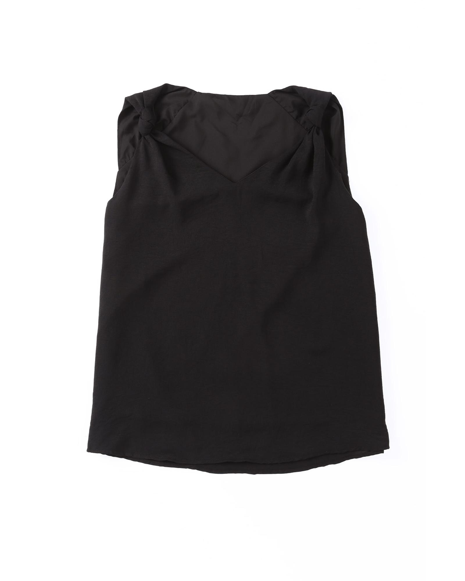 This black V neck knotted shoulder vest is a stylish and comfortable piece perfect for summer wear. Its unique design and high-quality materials make it a versatile addition to your wardrobe, suitable for pairing with various bottoms such as jeans, pants, shorts, and skirts.