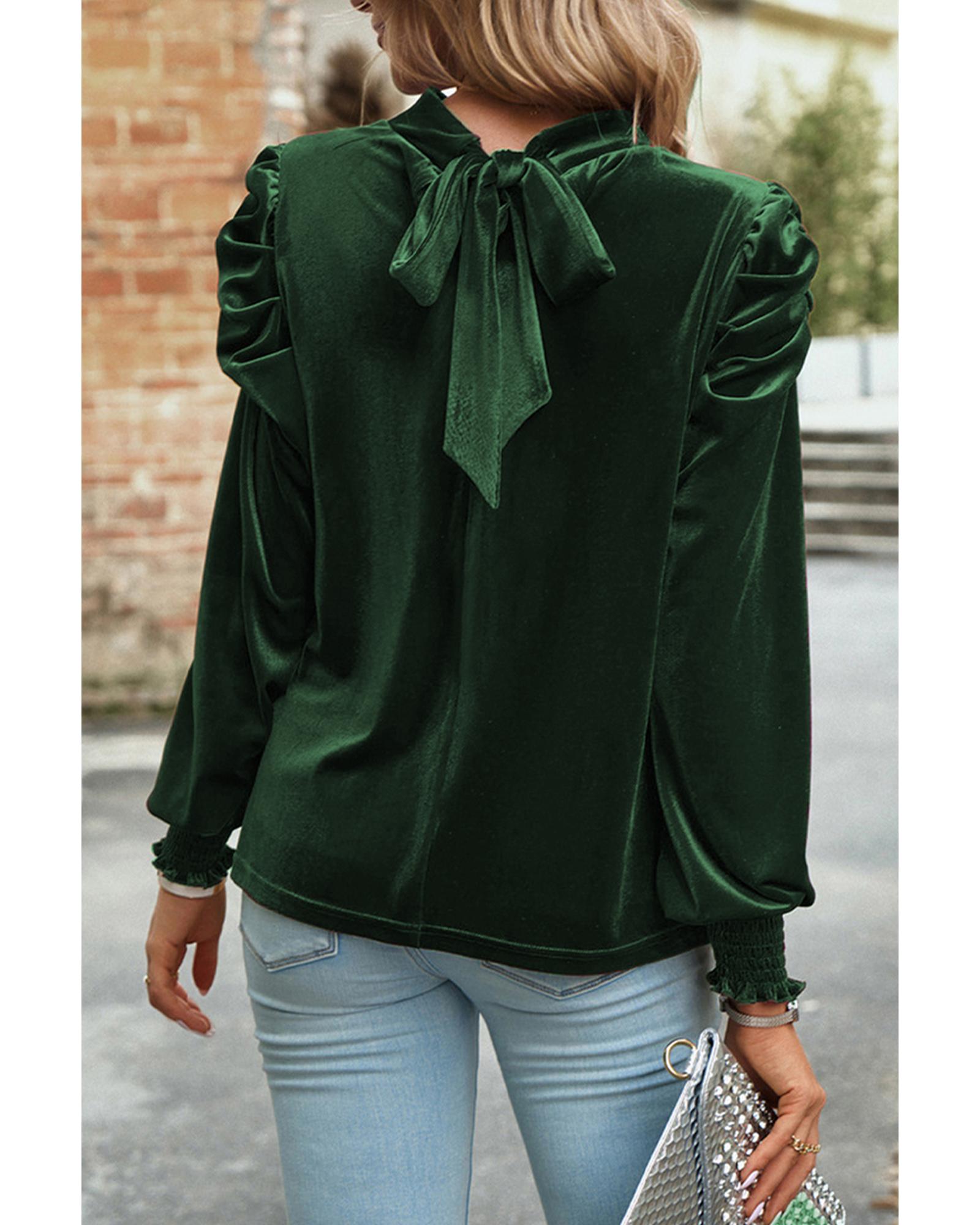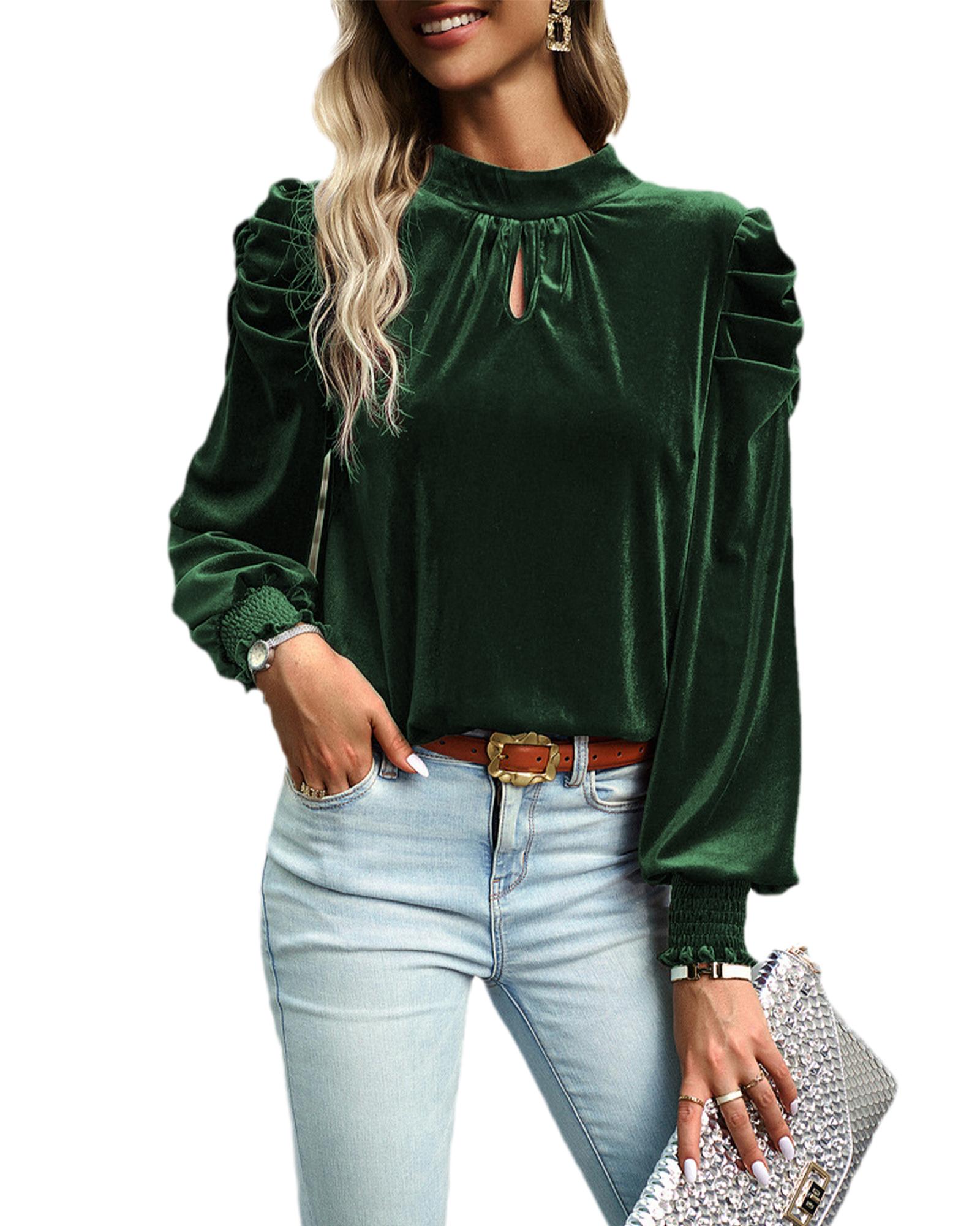 This velvet blouse features a sophisticated design with a mock neck and elegant puff sleeves, making it suitable for various occasions. Crafted from a soft and luxurious fabric, it offers both style and comfort. The unisex design adds versatility to your wardrobe.