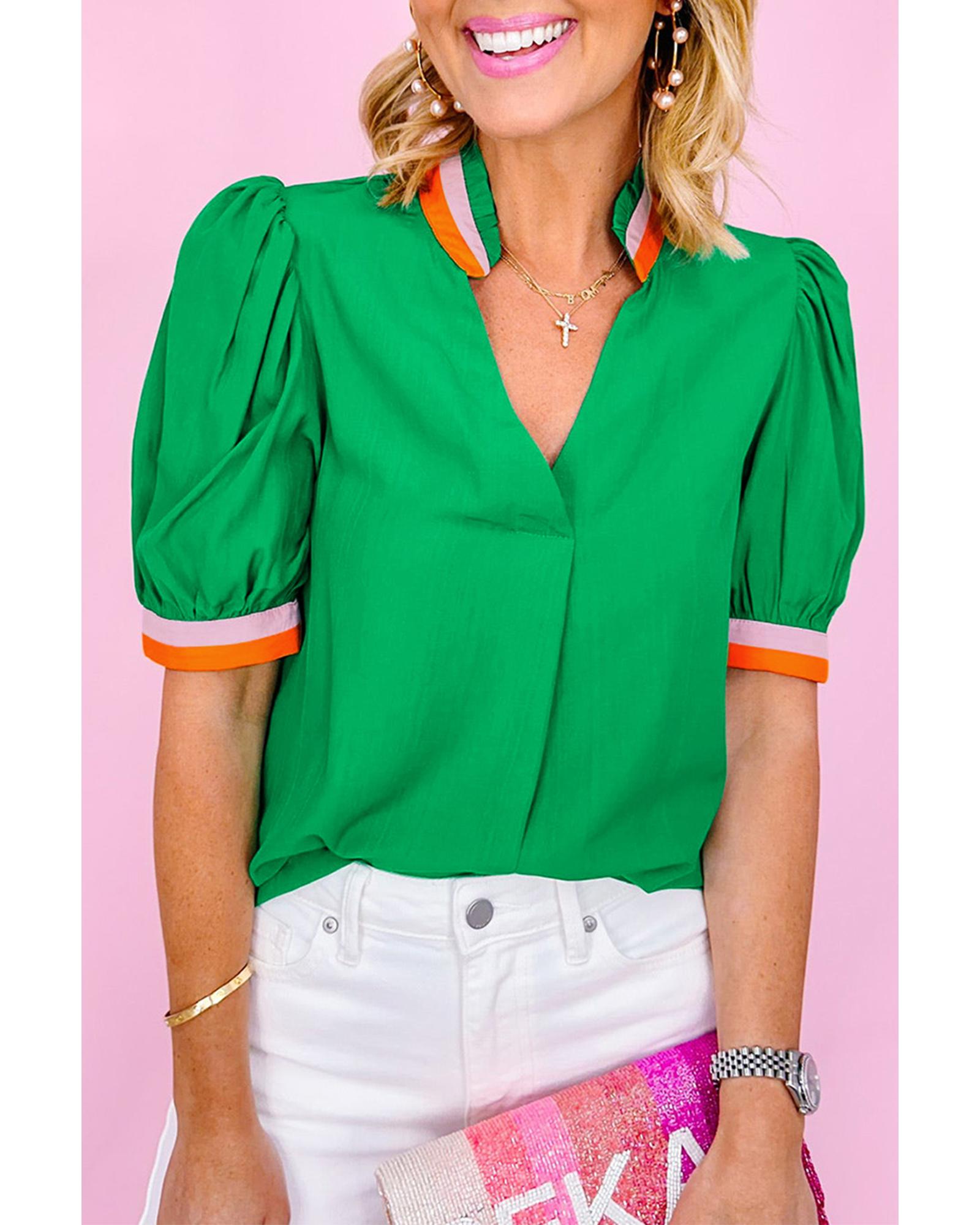 This vibrant blouse features a bright green color with colorful trim, making it a stylish addition to any wardrobe. The V-neck design with collar detail and puff sleeves adds a touch of elegance, suitable for both formal and casual occasions.
