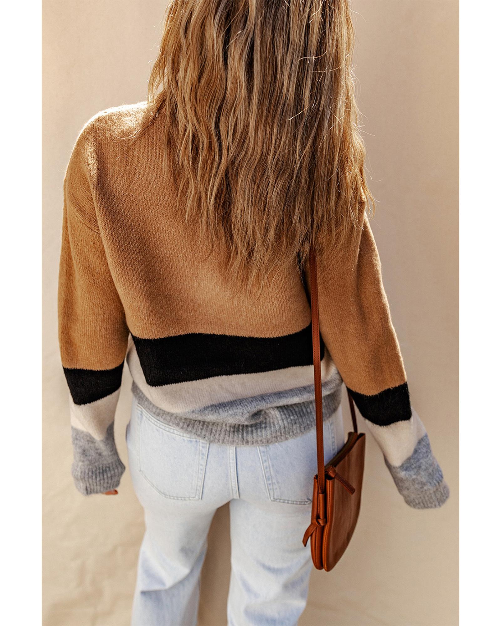 This sweater features a stylish color block and stripe design, combining comfort and fashion. Made from soft and cozy rib knit material, it is suitable for both casual and dressy occasions, providing warmth and a relaxed fit.