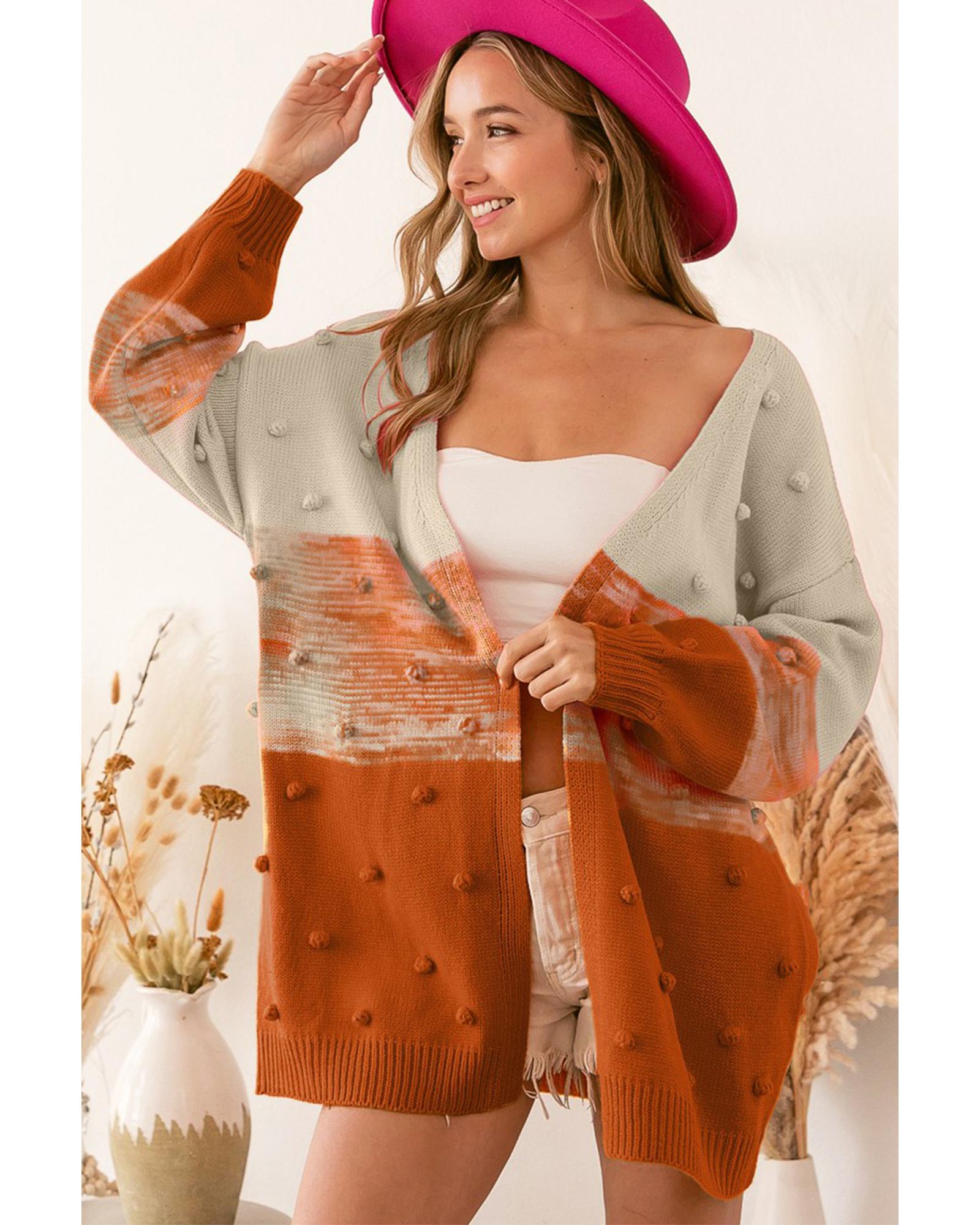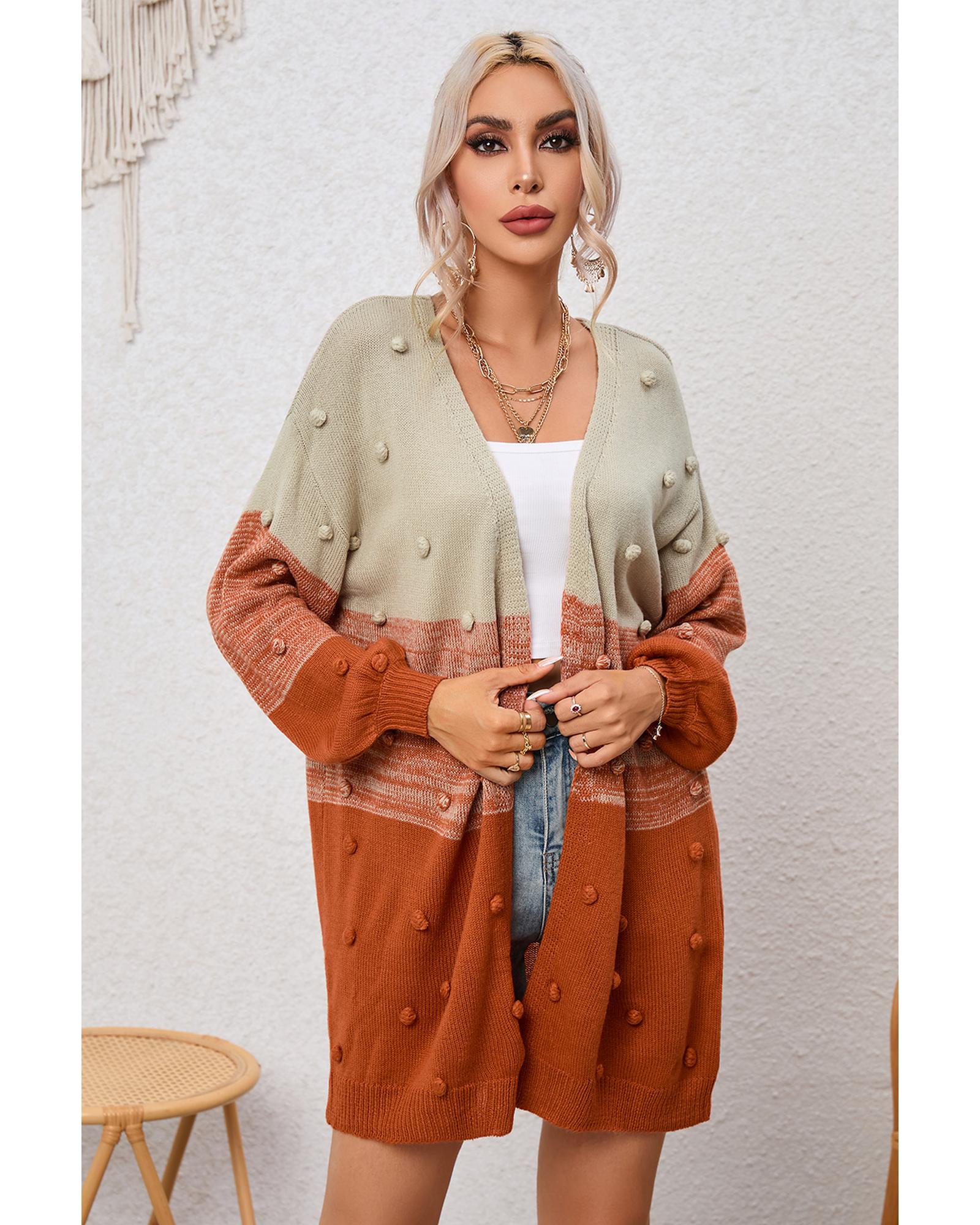 This open front cardigan features a color block design and charming pompom details, making it a stylish and versatile addition to your wardrobe. Its warm knit fabric provides comfort and a fashionable look, perfect for layering in various outfits.
