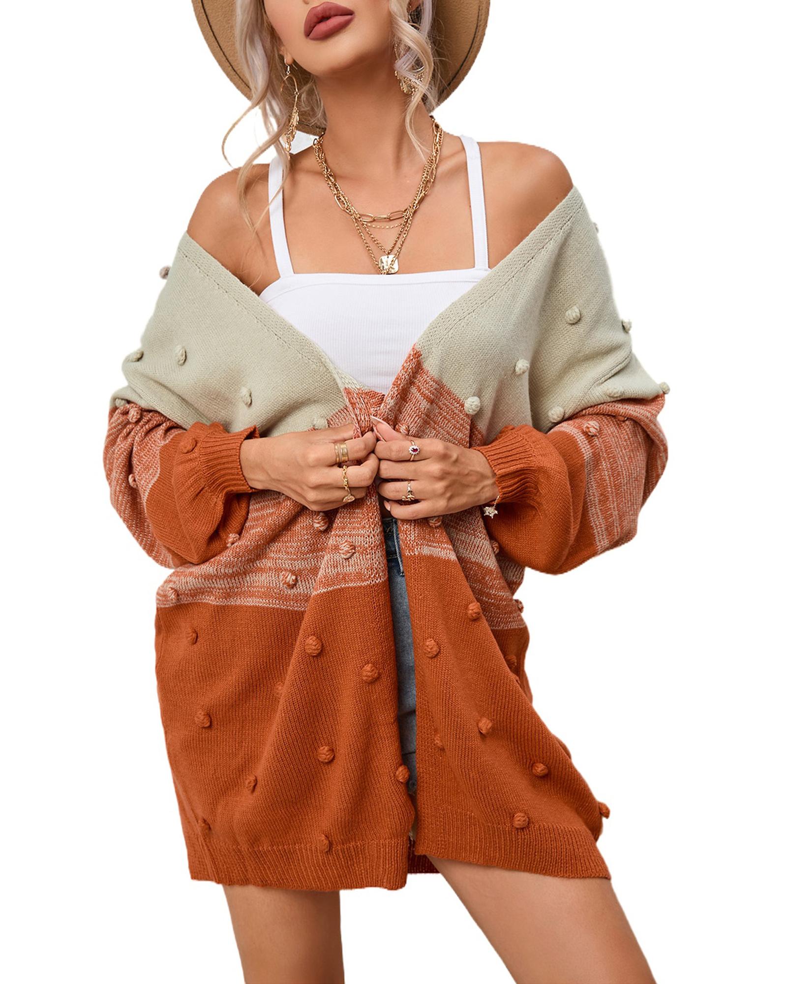 This open front cardigan features a color block design and charming pompom details, making it a stylish addition to your wardrobe. It is perfect for layering and provides a warm, comfortable fit with high elasticity. The knit material ensures both warmth and style, suitable for various casual occasions.