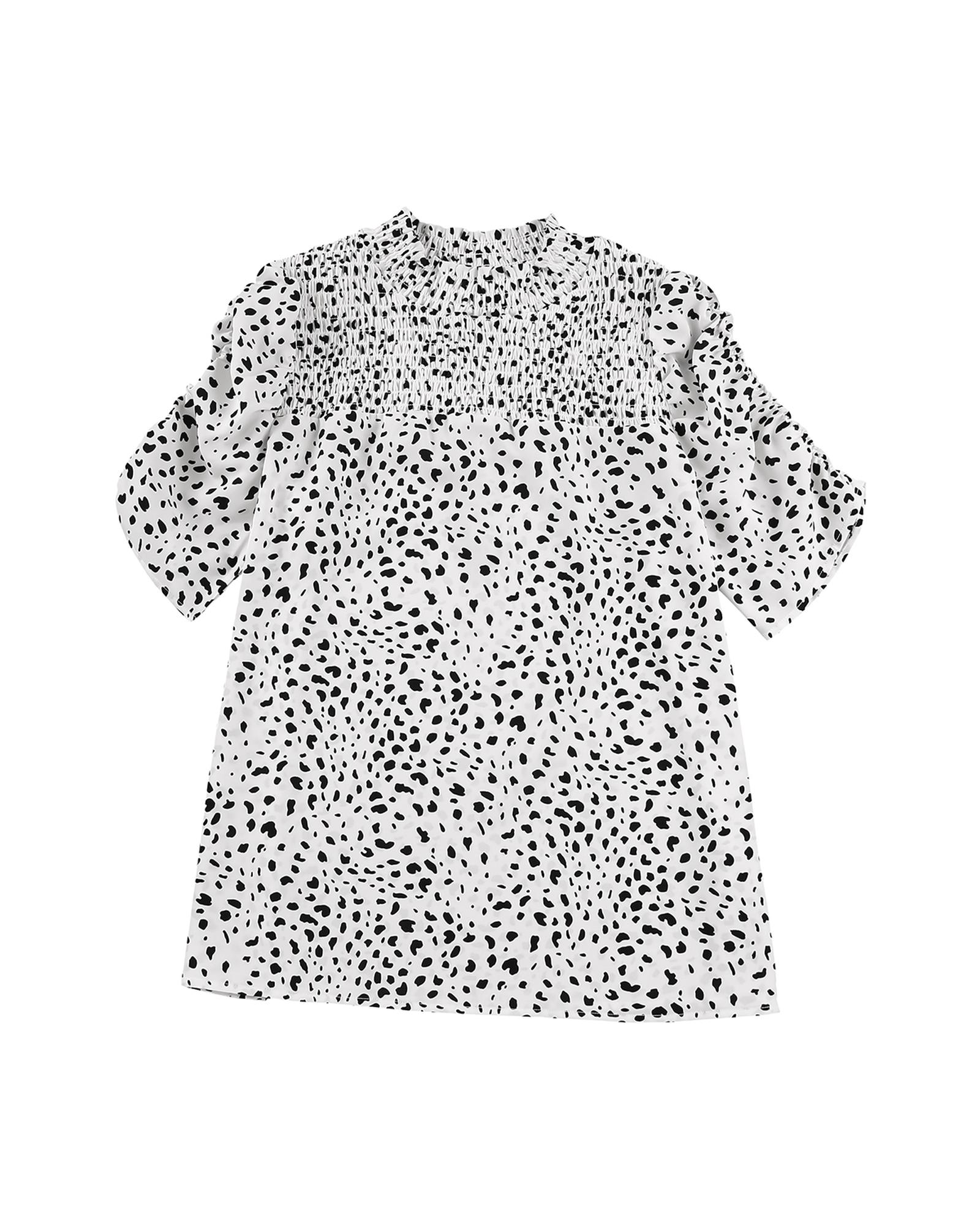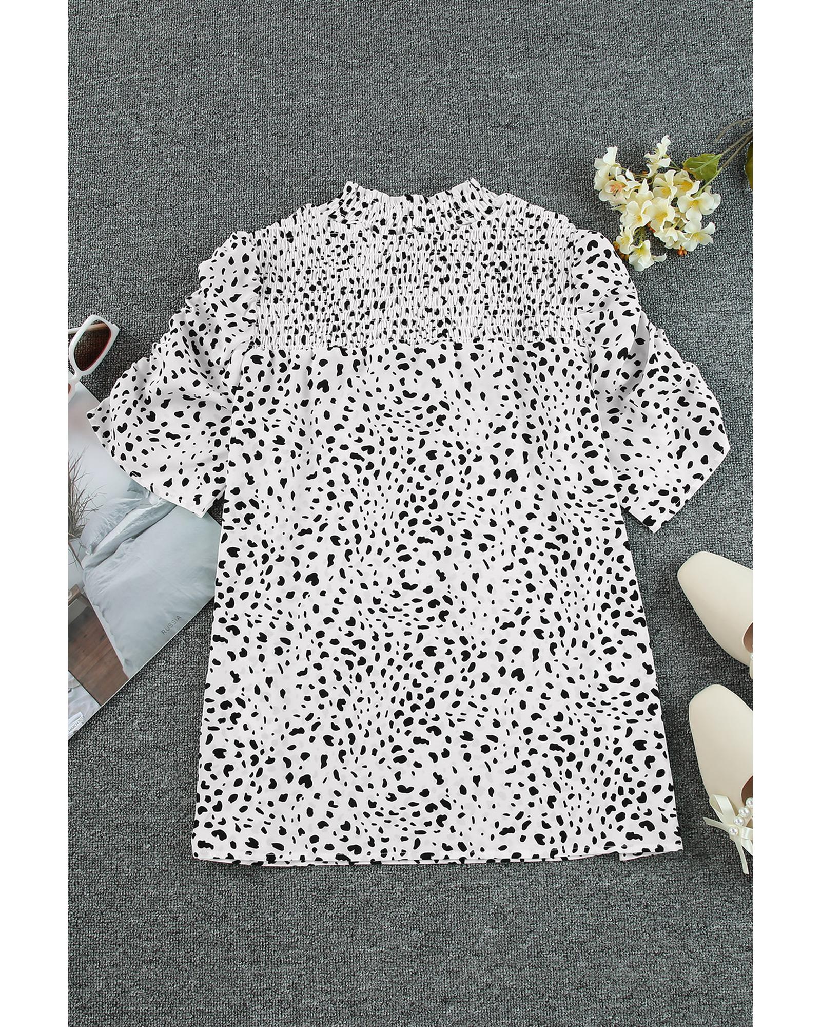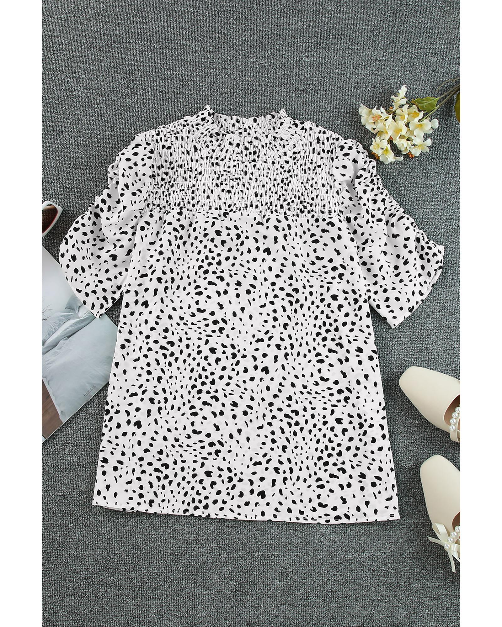 This blouse features a luxurious smocking detail and stylish bubble sleeves, making it a fashionable choice for various occasions. Crafted from high-quality polyester, it offers a comfortable fit and trendy appearance. Designed for women, this blouse adds a chic touch to any outfit and is an essential piece for a modern wardrobe.