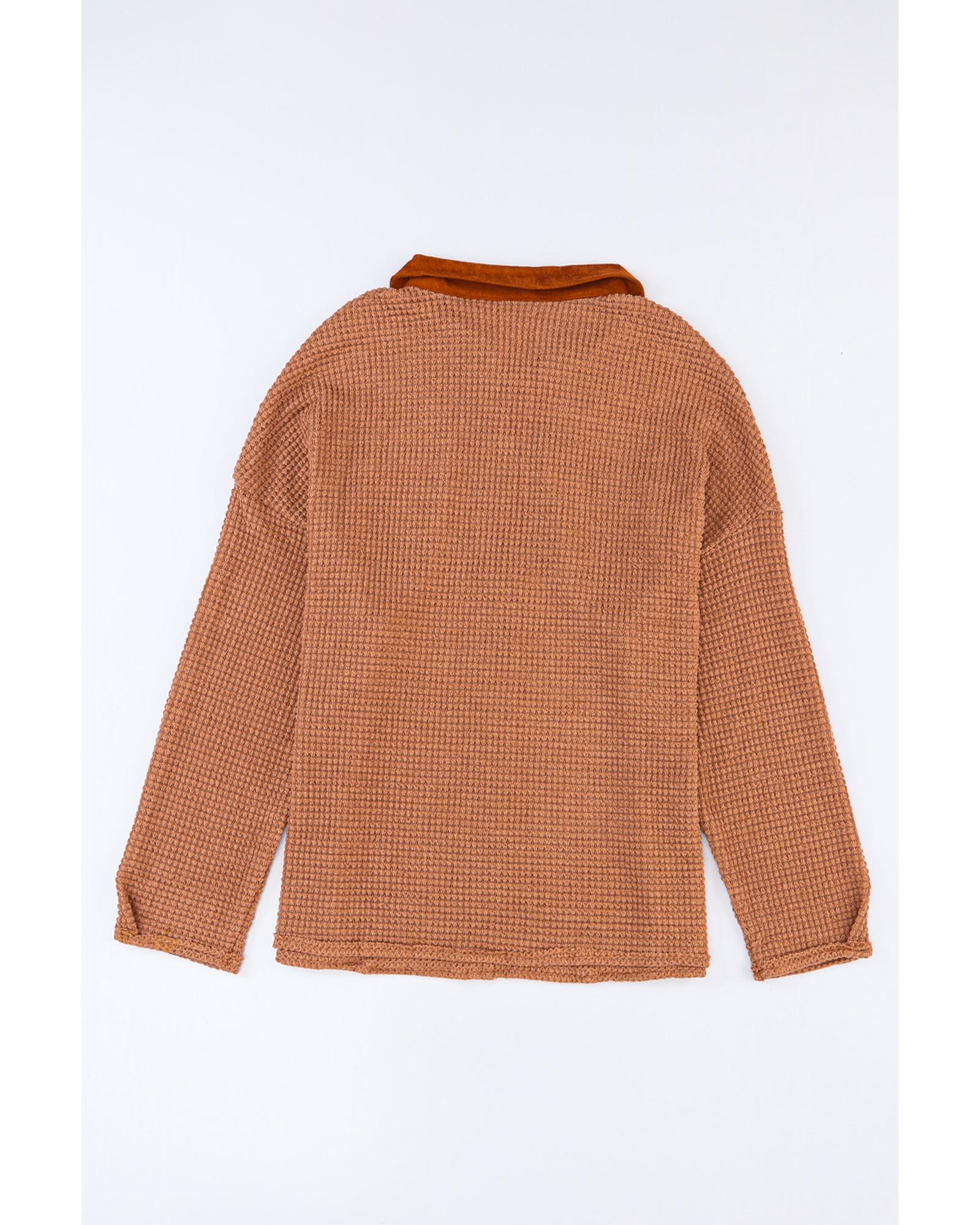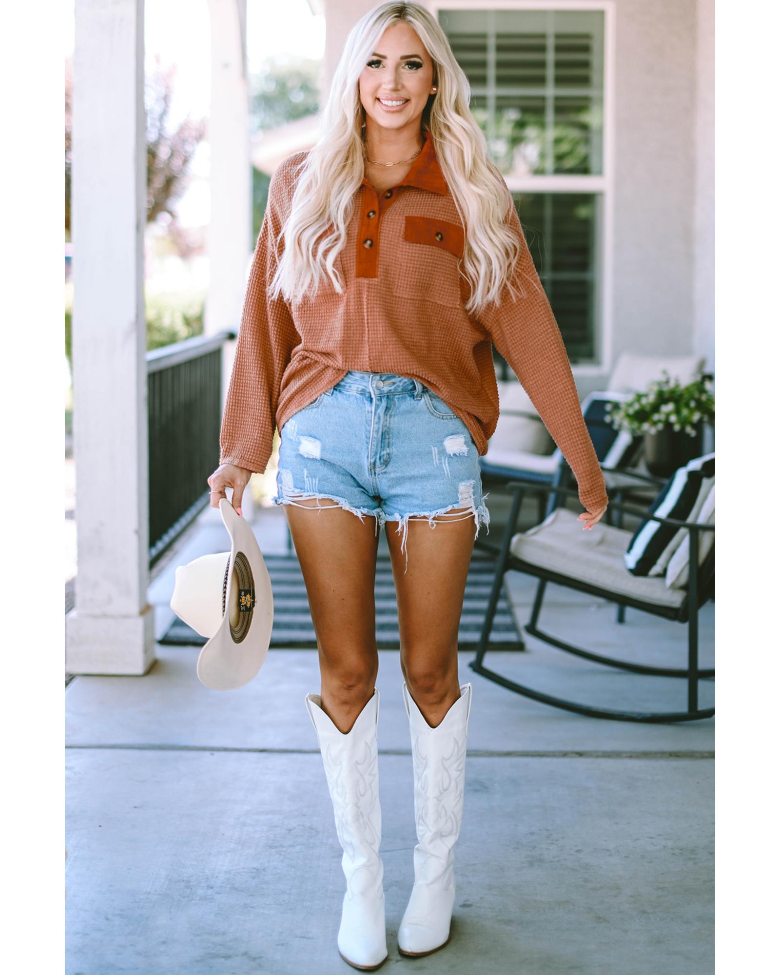 This waffle knit top features a comfortable and cozy fabric with stylish button contrast trim. Designed with long sleeves, it provides added warmth and coverage. The loose fit offers a relaxed and effortless look, making it suitable for casual wear.