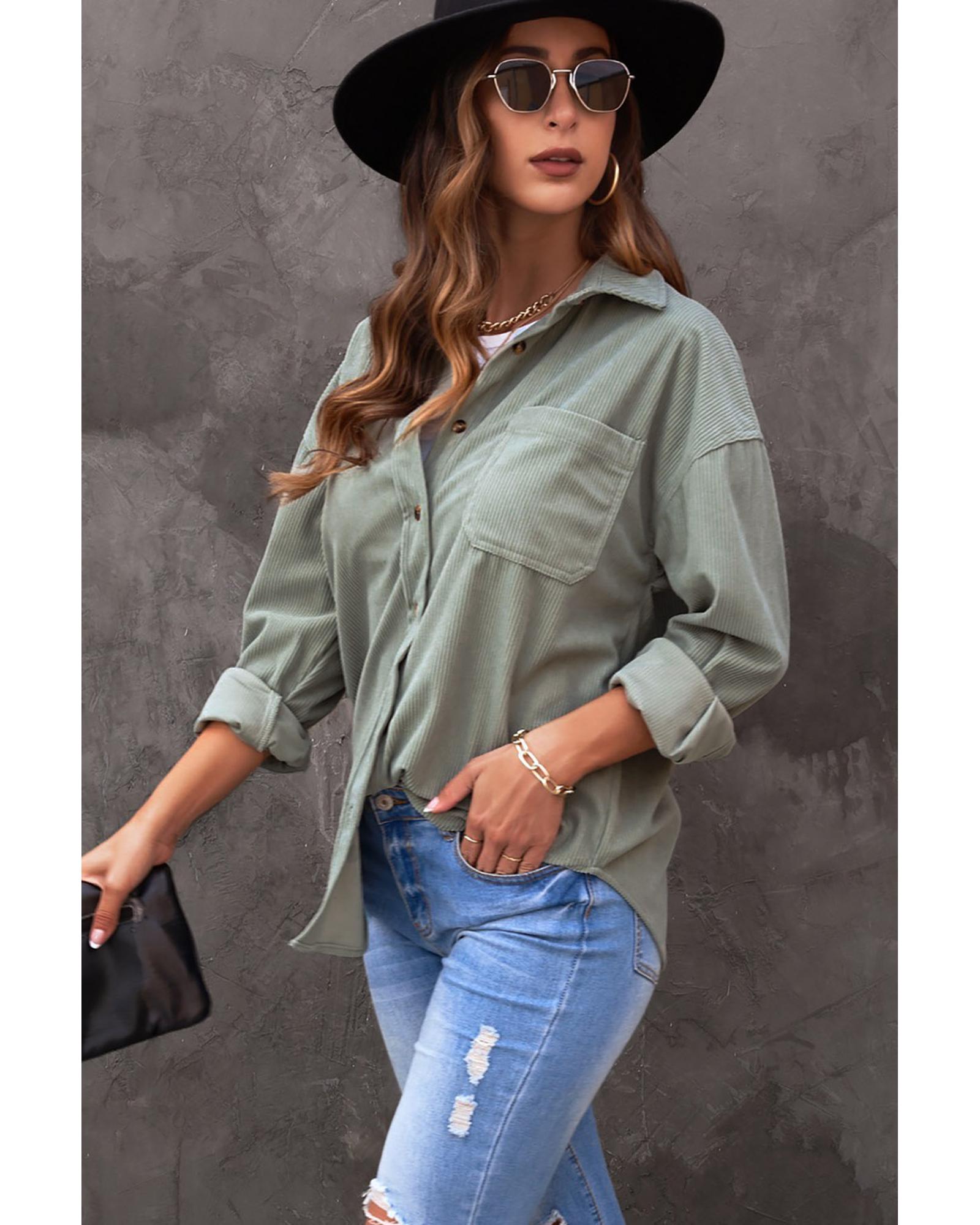 This exchange button pocket shirt is a versatile wardrobe essential designed for women. Crafted from quality corduroy fabric, it combines classic style with functional details, making it suitable for various occasions and looks.