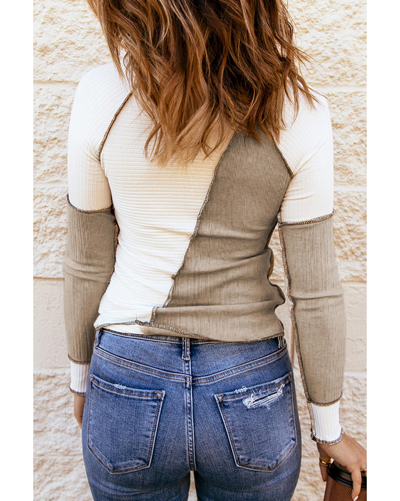 This color block rib knit top features a luxurious irregular seaming design, offering a stylish and versatile addition to any wardrobe. Crafted from high-quality materials, it combines comfort with a flattering fit suitable for various occasions.