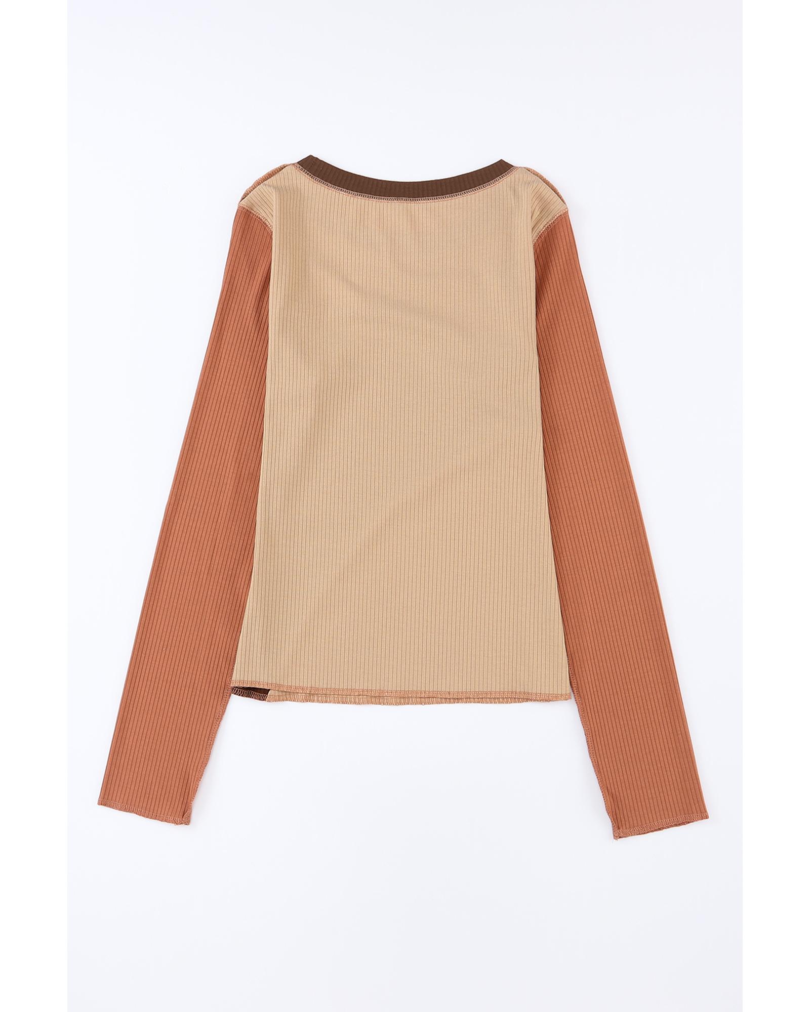 This color block ribbed knit top features an exposed seam design, offering a stylish and versatile addition to any woman’s wardrobe. Its unique color blocking and textured ribbed fabric provide both visual interest and comfort, making it suitable for a variety of occasions from casual to dressier. The top is designed to offer a flattering fit with timeless appeal.
