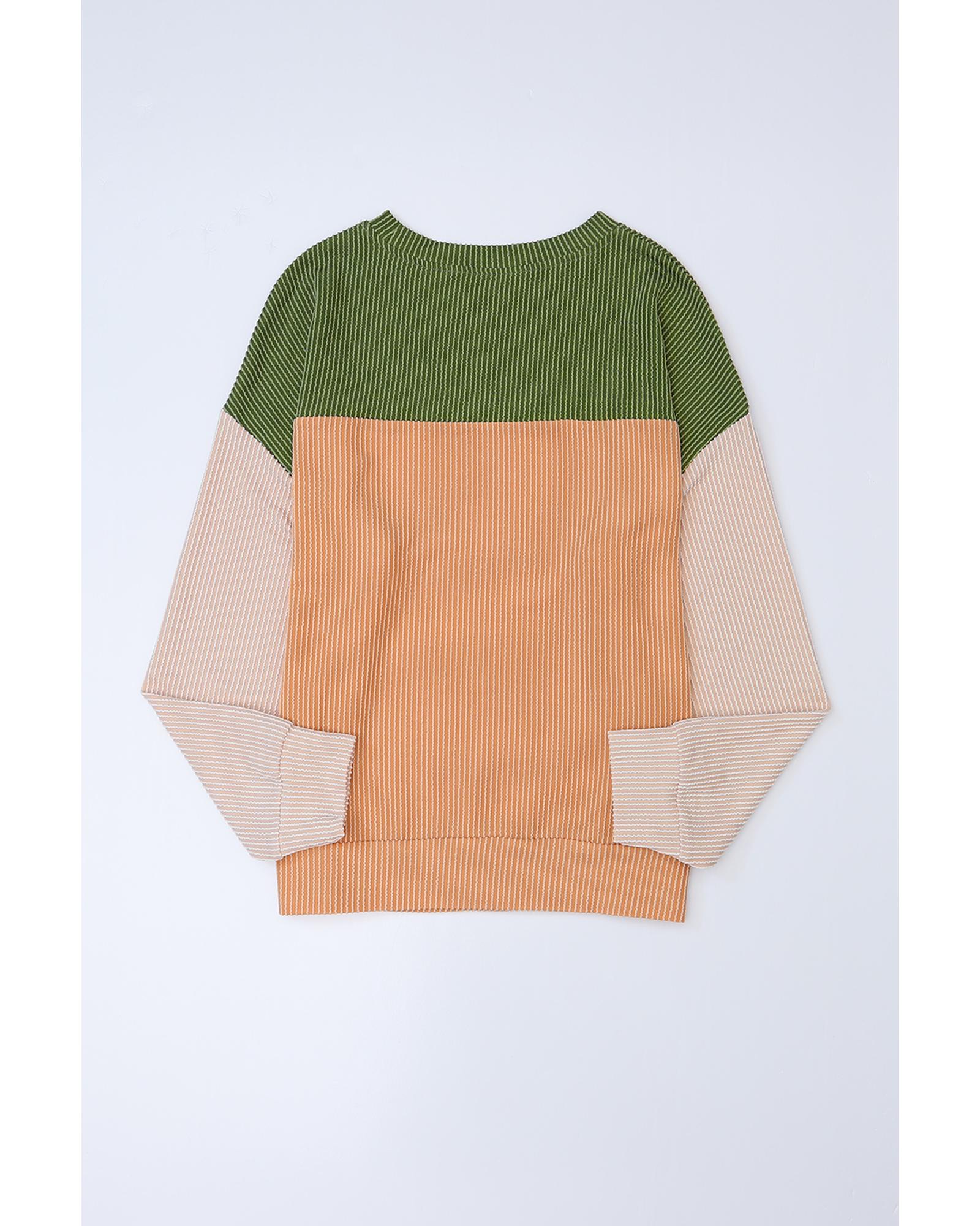 This long sleeve top features a stylish color block design that offers a casual yet chic appearance. Its ribbed texture provides a comfortable and flattering fit, making it suitable for everyday wear. The long sleeves add extra coverage, making it an ideal choice for cooler days.
