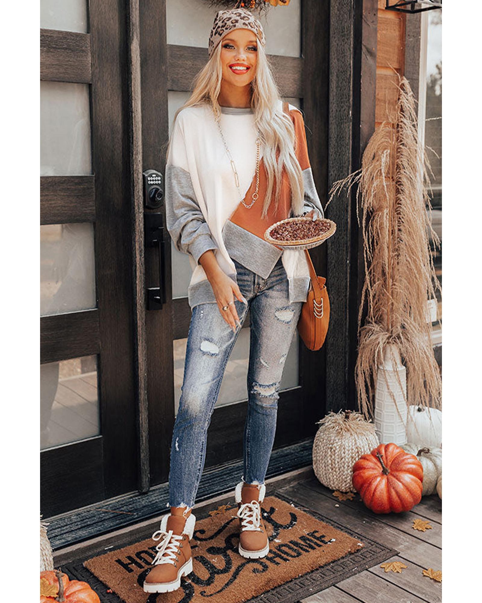 This long sleeve top features a stylish colorblock design with contrasting stitching details and an irregular hem, offering a trendy and versatile look suitable for various occasions. Its long sleeves provide extra coverage, making it a fashionable choice for both casual and dressy outfits.