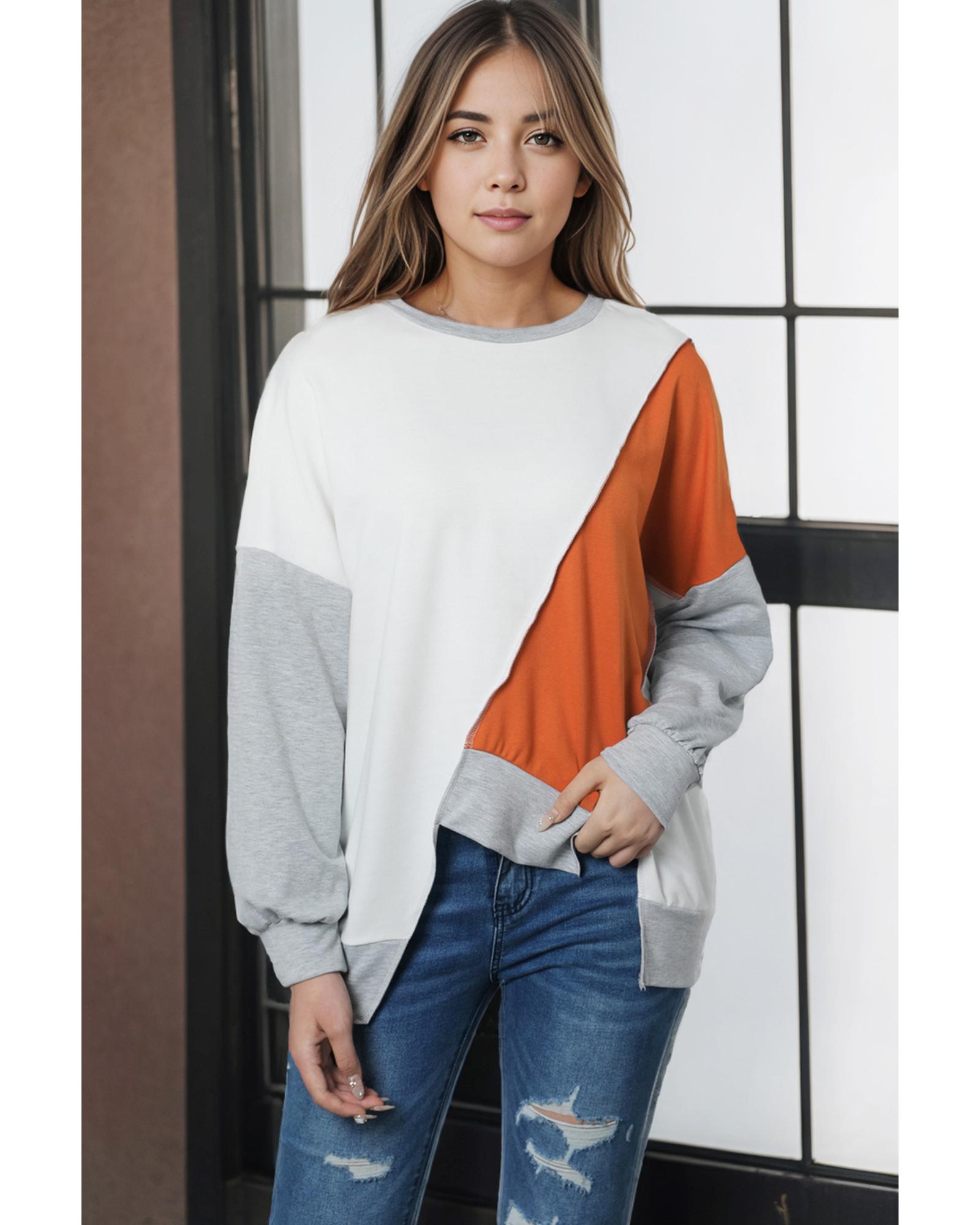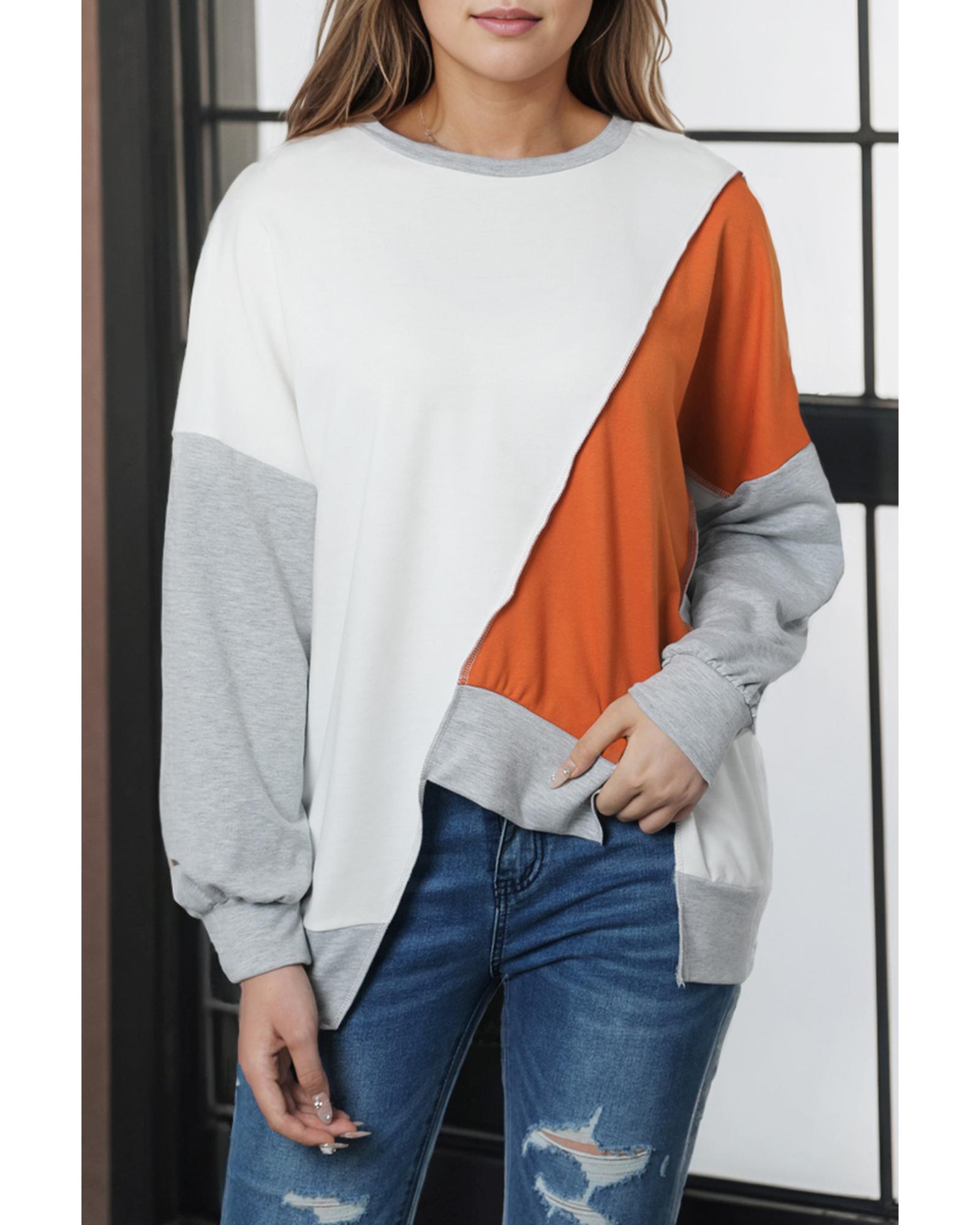 This long sleeve top features a stylish colorblock design with contrasting stitching details and an irregular hem for a trendy look. It offers long sleeves for added coverage and versatility, making it suitable for both casual and dressy occasions. Crafted from quality materials, it is a fashionable addition to any wardrobe.