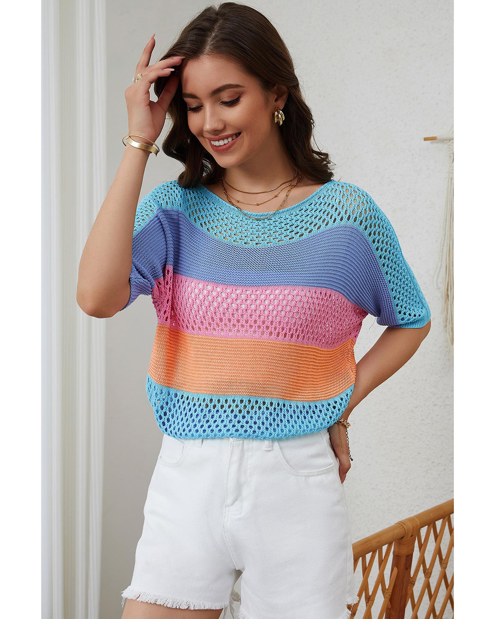 This colorblock striped knitted top features a vibrant and eye-catching design, making it a stylish addition to any wardrobe. Crafted from comfortable knitted fabric, it offers a trendy look with its striped pattern and half sleeves. Suitable for various occasions, this versatile piece combines fashion and comfort effortlessly.
