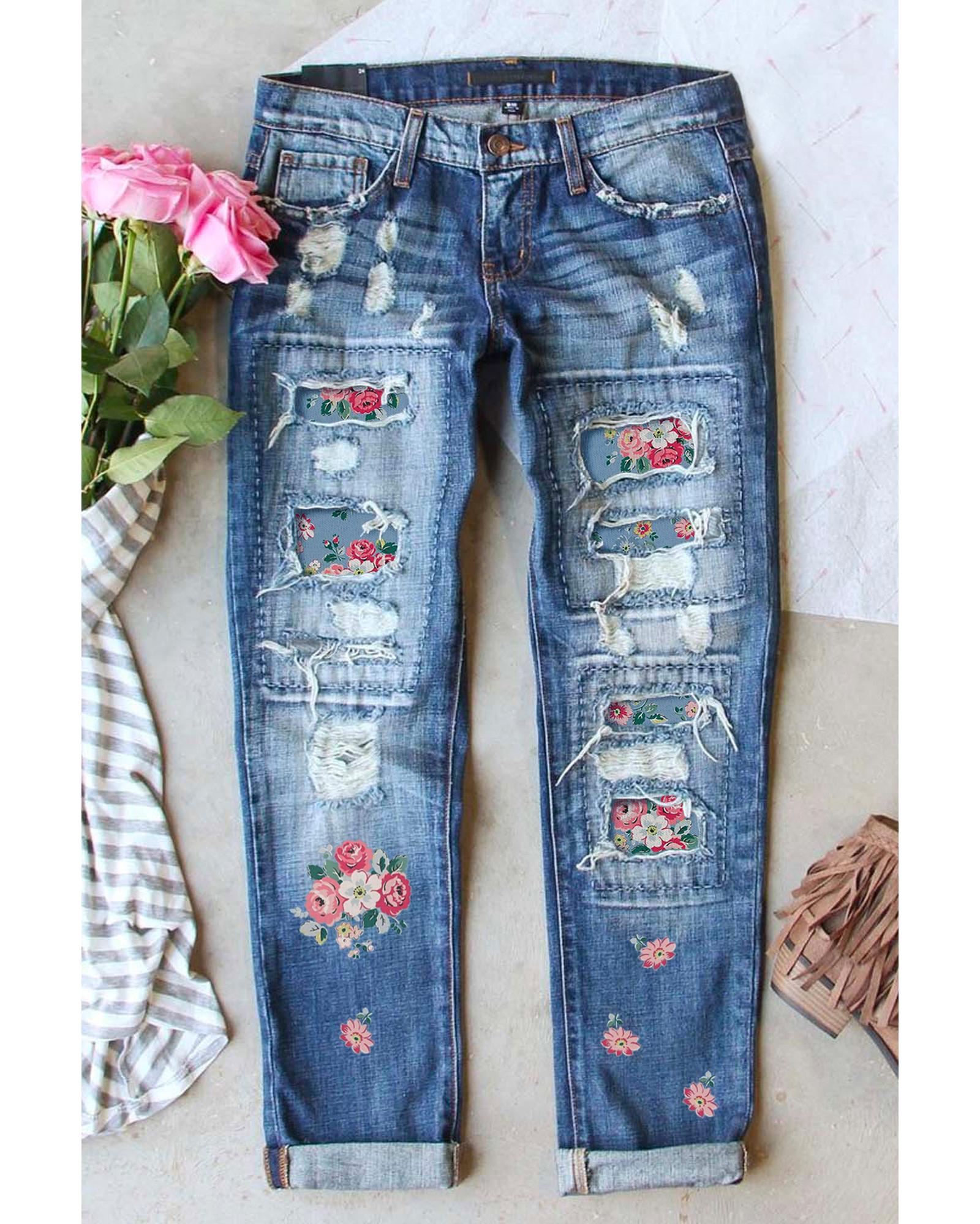 This pair of contrast distressed mid waist jeans features a stylish floral print combined with contrasting distressed details, offering a fashionable and trendy look. Designed with a flattering mid waist fit, these jeans are crafted to provide both comfort and style for women.