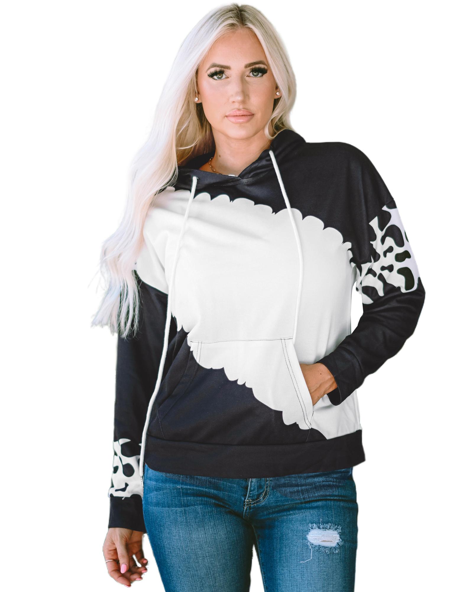This pullover hoodie features a trendy cow tie dye print, combining style and comfort for everyday wear. It is designed with practical details such as spacious pockets and an adjustable drawstring closure, making it suitable for various casual occasions.