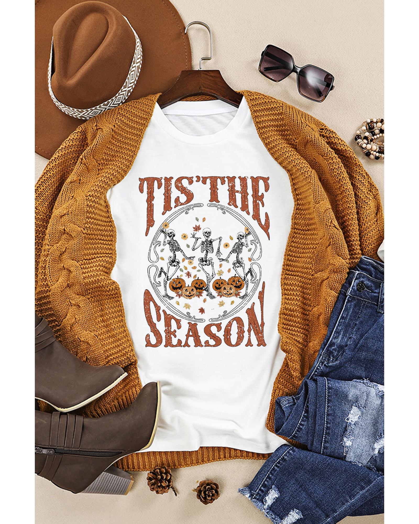 This stylish white graphic tee features a playful dancing skeleton design, making it a fun addition to your wardrobe. It is suitable for various occasions, whether casual or dressed-up, and pairs easily with different bottoms and accessories.