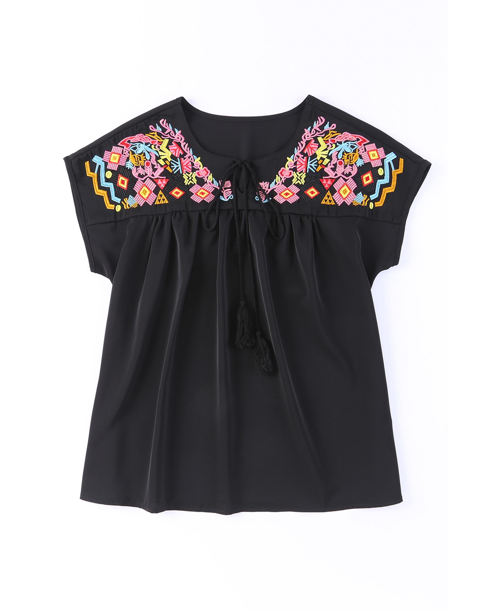 This embroidered short sleeve blouse features intricate geometric floret embroidery, adding a touch of elegance to your wardrobe. Its short sleeve design makes it ideal for warmer weather, providing both comfort and style. Crafted from high-quality materials, this blouse offers durability and a refined appearance, making it suitable for various occasions.