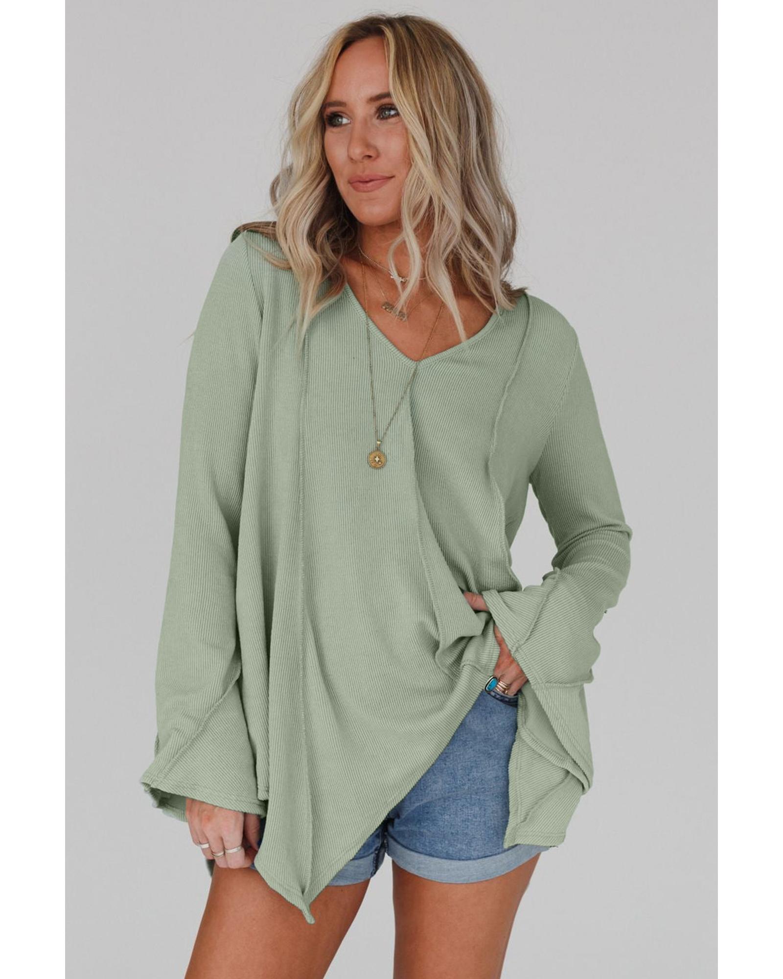 This ribbed expose seam bell sleeve top combines a trendy design with comfortable wear. Its unique exposed seams and bell sleeves create a feminine and elegant silhouette, making it suitable for both casual and formal occasions. Crafted from high-quality materials, it offers durability and a flattering fit.