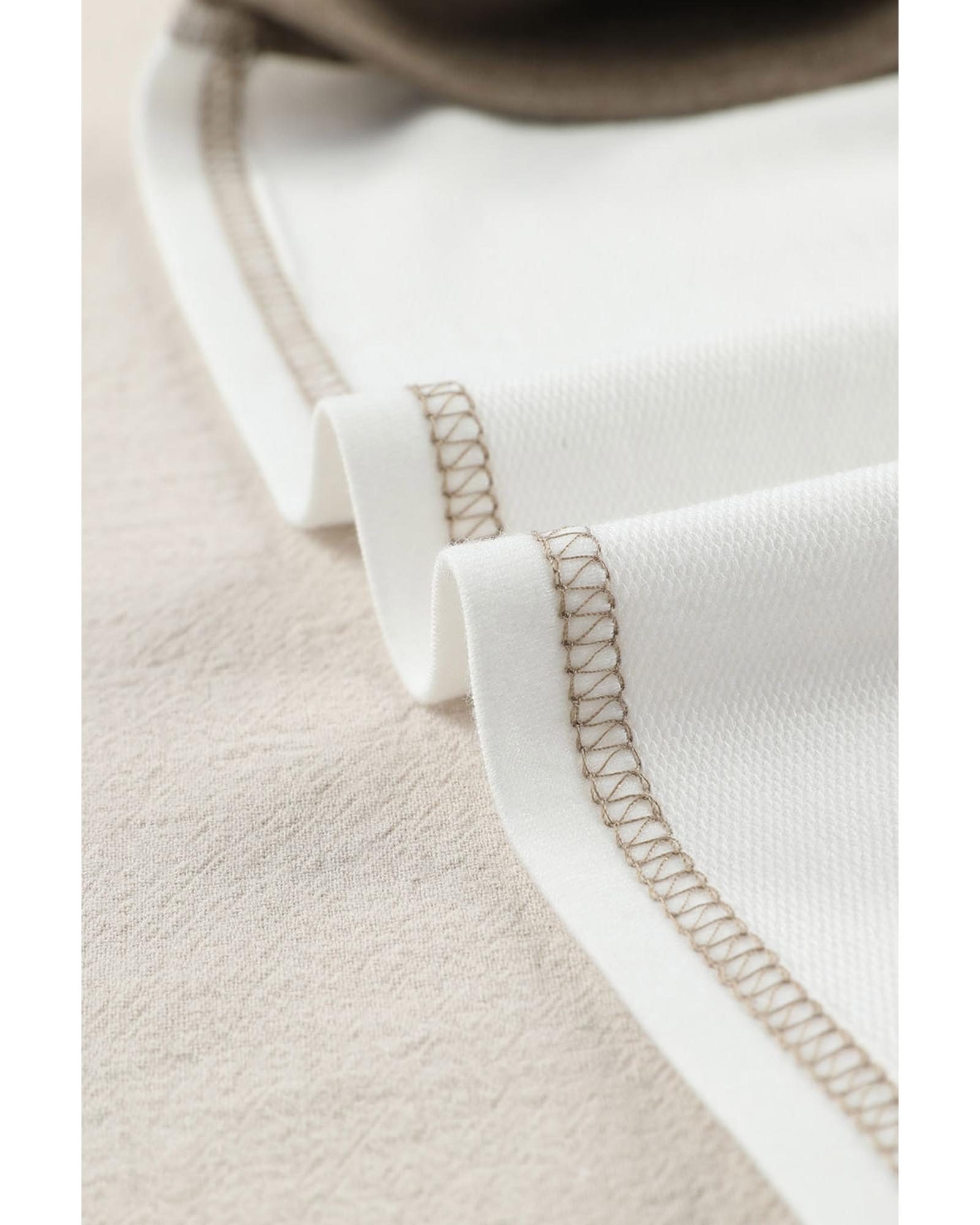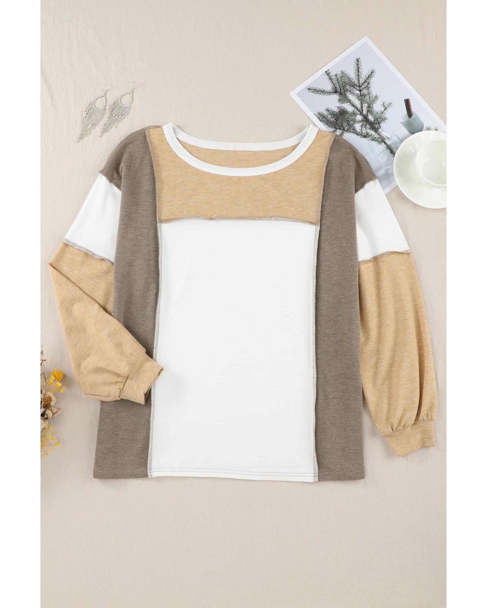 This top features a stylish and trendy design with a unique color block pattern and exposed seams. Its khaki color provides a natural and earthy vibe, making it suitable for various casual or dressy occasions. Crafted from quality materials, it offers a comfortable fit with a luxurious feel. The versatile and fashion-forward design helps you stand out from the crowd.