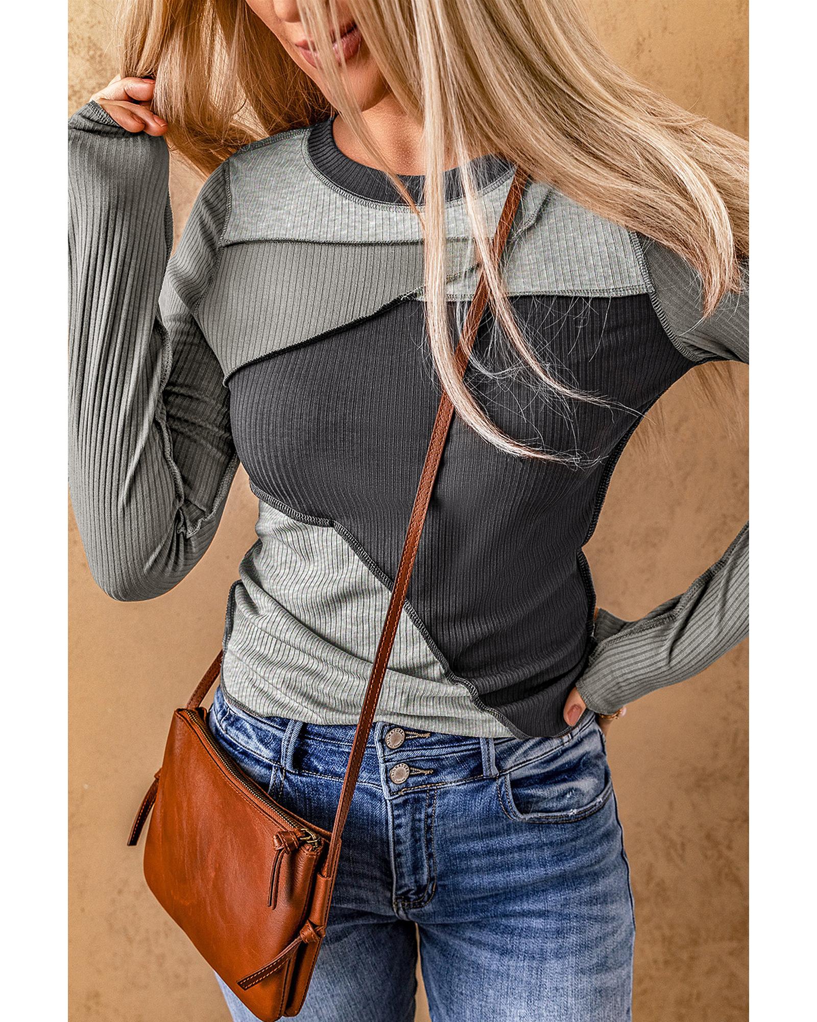 This ribbed knit top features a stylish color block design with exposed seams, offering a versatile and fashionable option suitable for both casual and formal occasions. Crafted from high-quality fabric, it provides a comfortable and flattering fit that enhances your overall look.