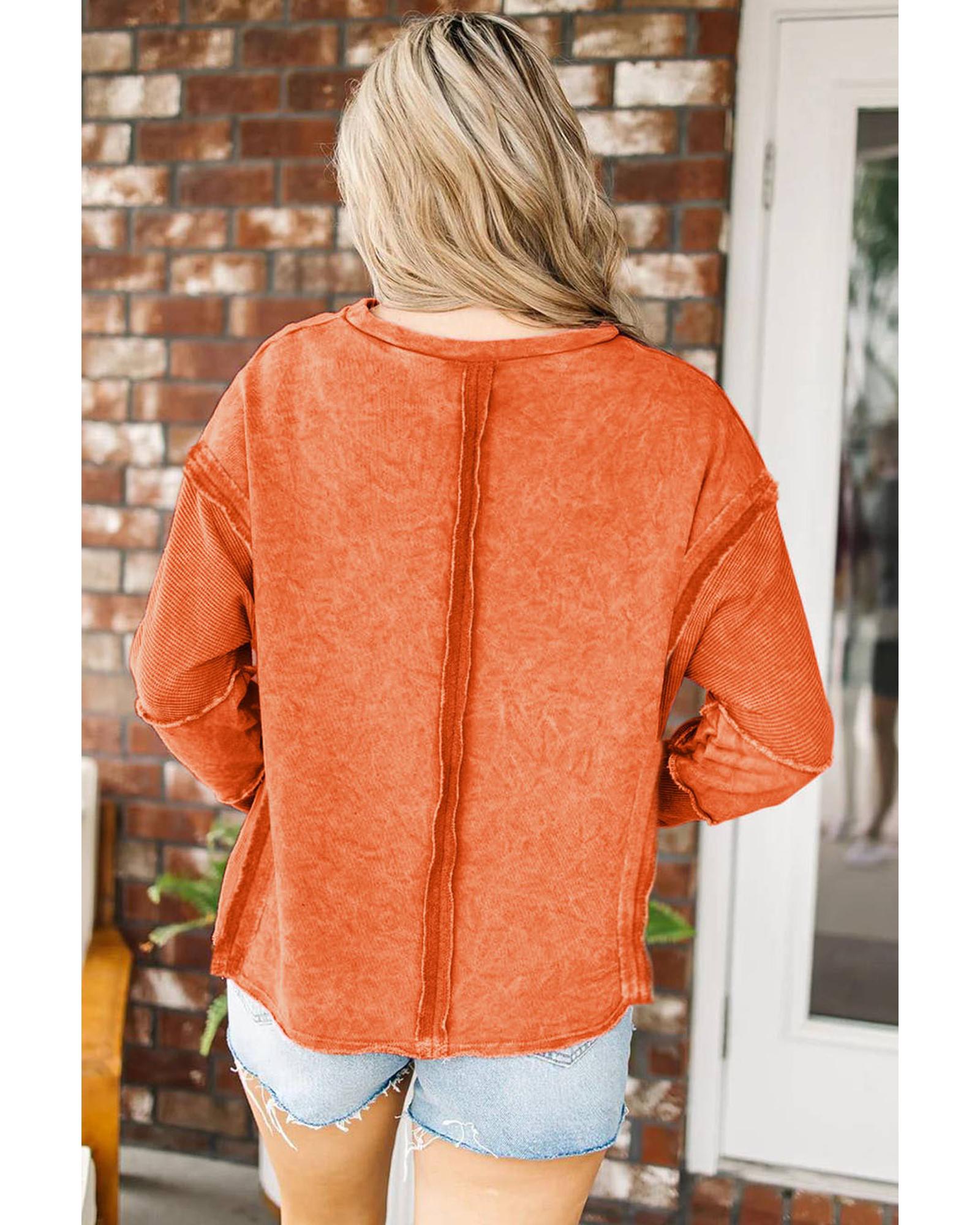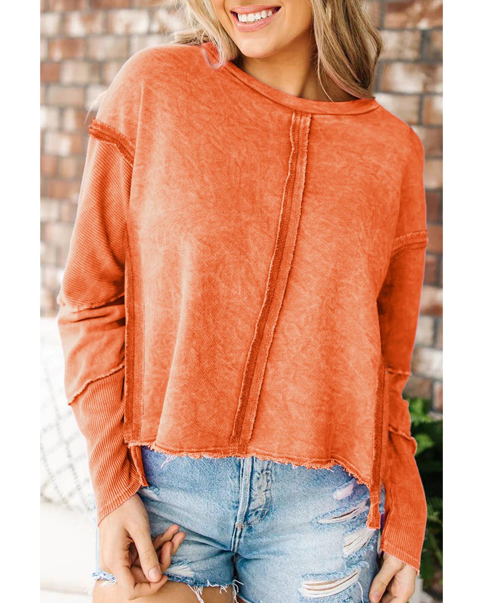 This sweatshirt features a stylish design with exposed seams and a raw edge finish, creating a trendy and unique look. The high-low hemline adds a distinctive silhouette, making it suitable for casual or athleisure wear. Its vibrant color and comfortable fit make it a versatile addition to any wardrobe.