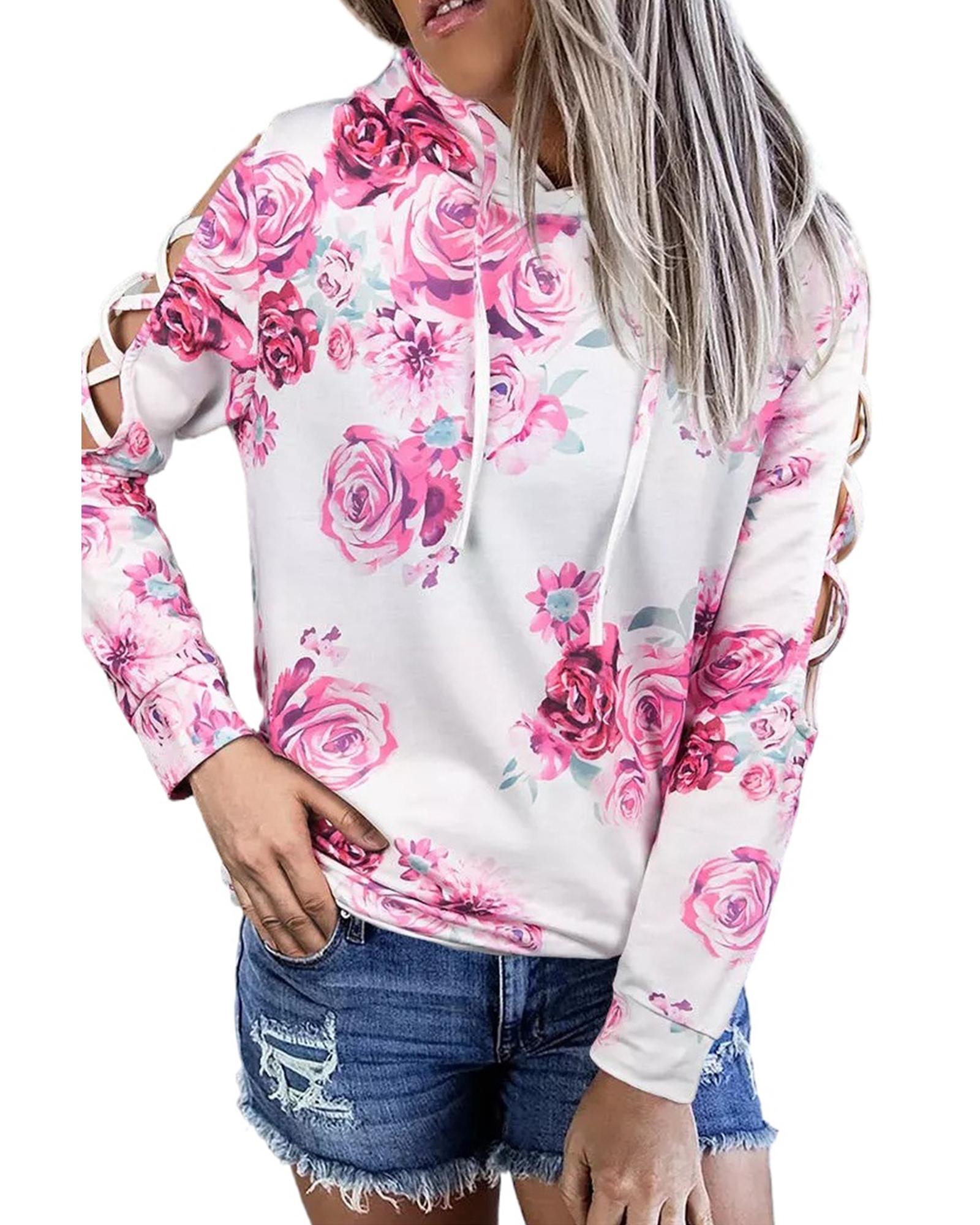 This floral print cold shoulder hoodie combines stylish design with comfortable wear, making it an ideal choice for everyday use. It features trendy criss-cross detailing on the cold shoulder and a vibrant floral pattern that adds a fashionable touch to your outfit.