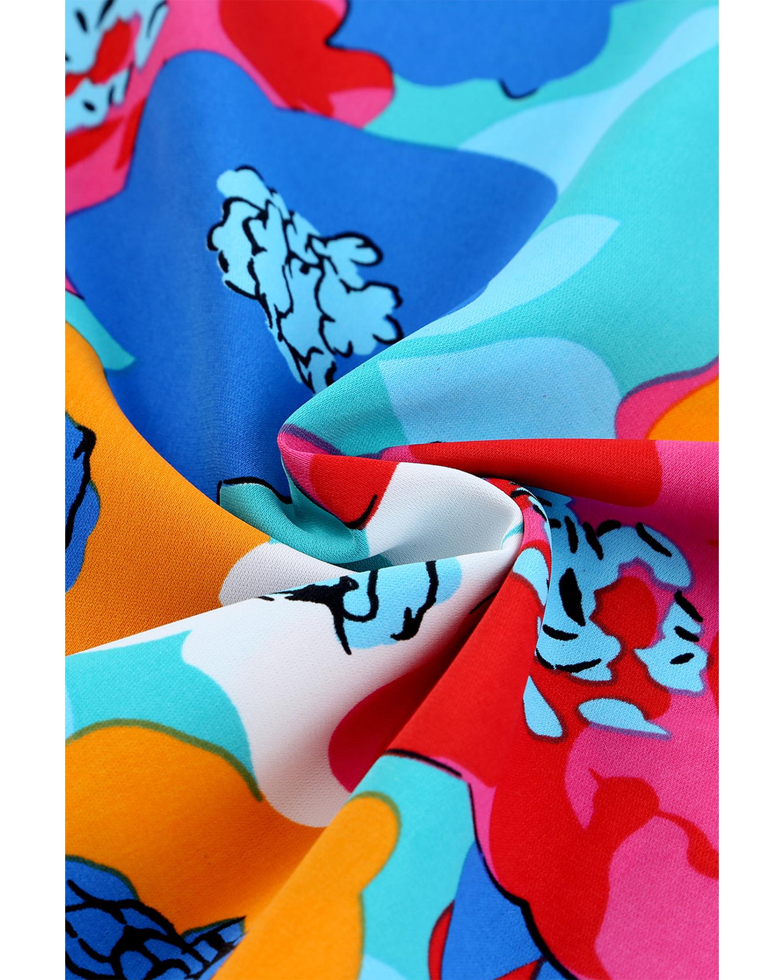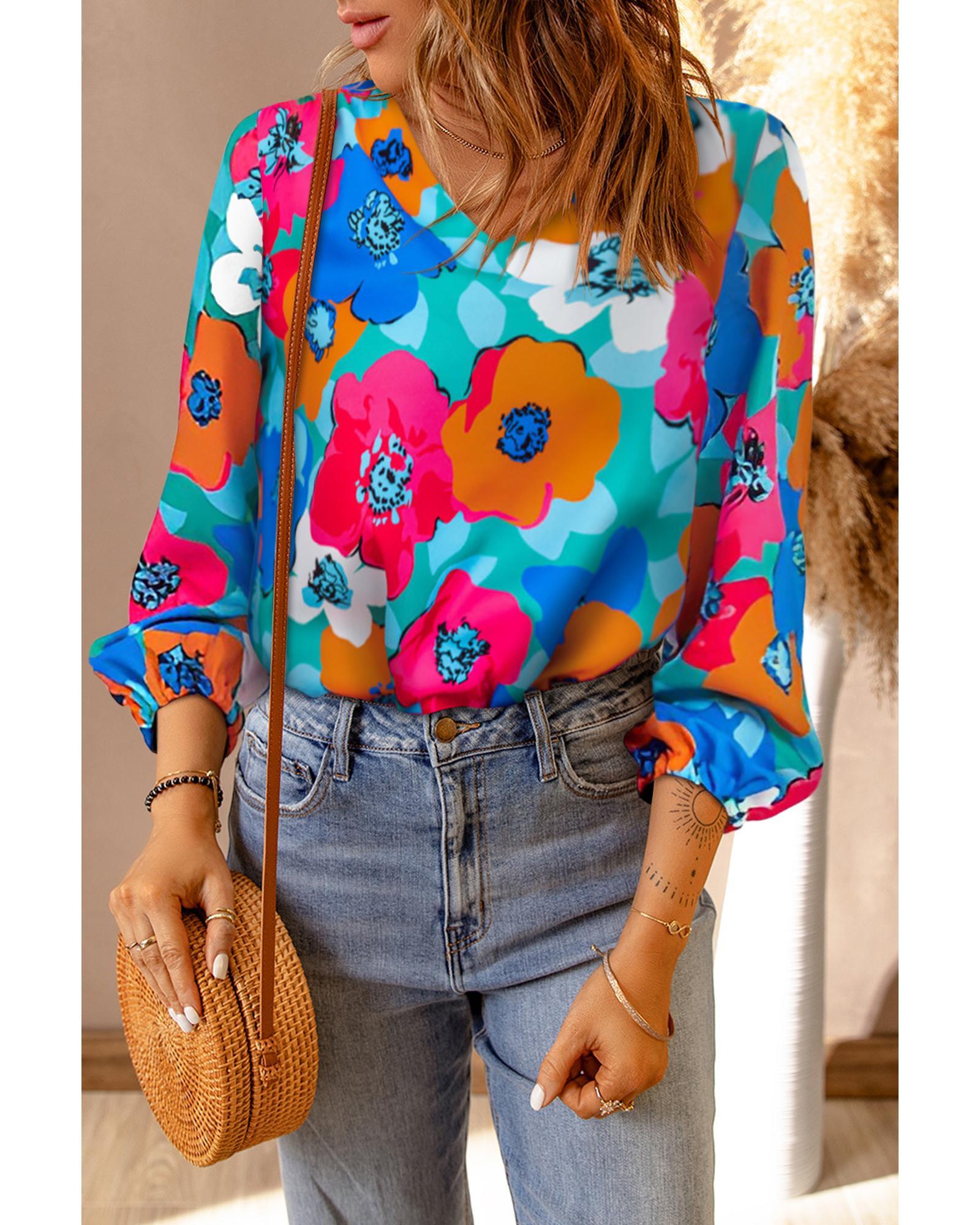 This floral print V-neck blouse features a vibrant multicolor design and a flattering neckline, making it suitable for various occasions. Its versatile 3/4 sleeves add to its stylish and comfortable appeal, crafted from high-quality materials for durability and ease of wear.