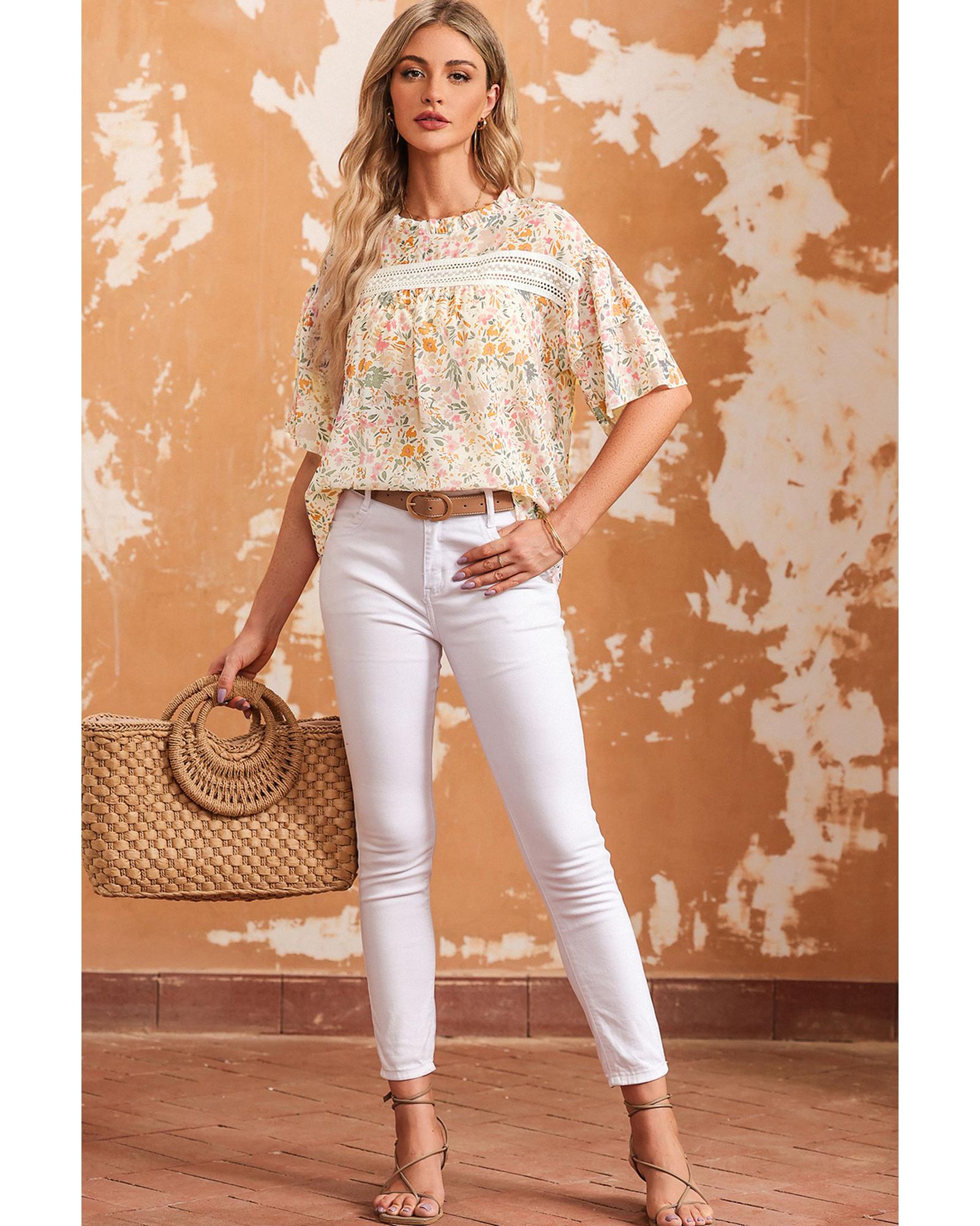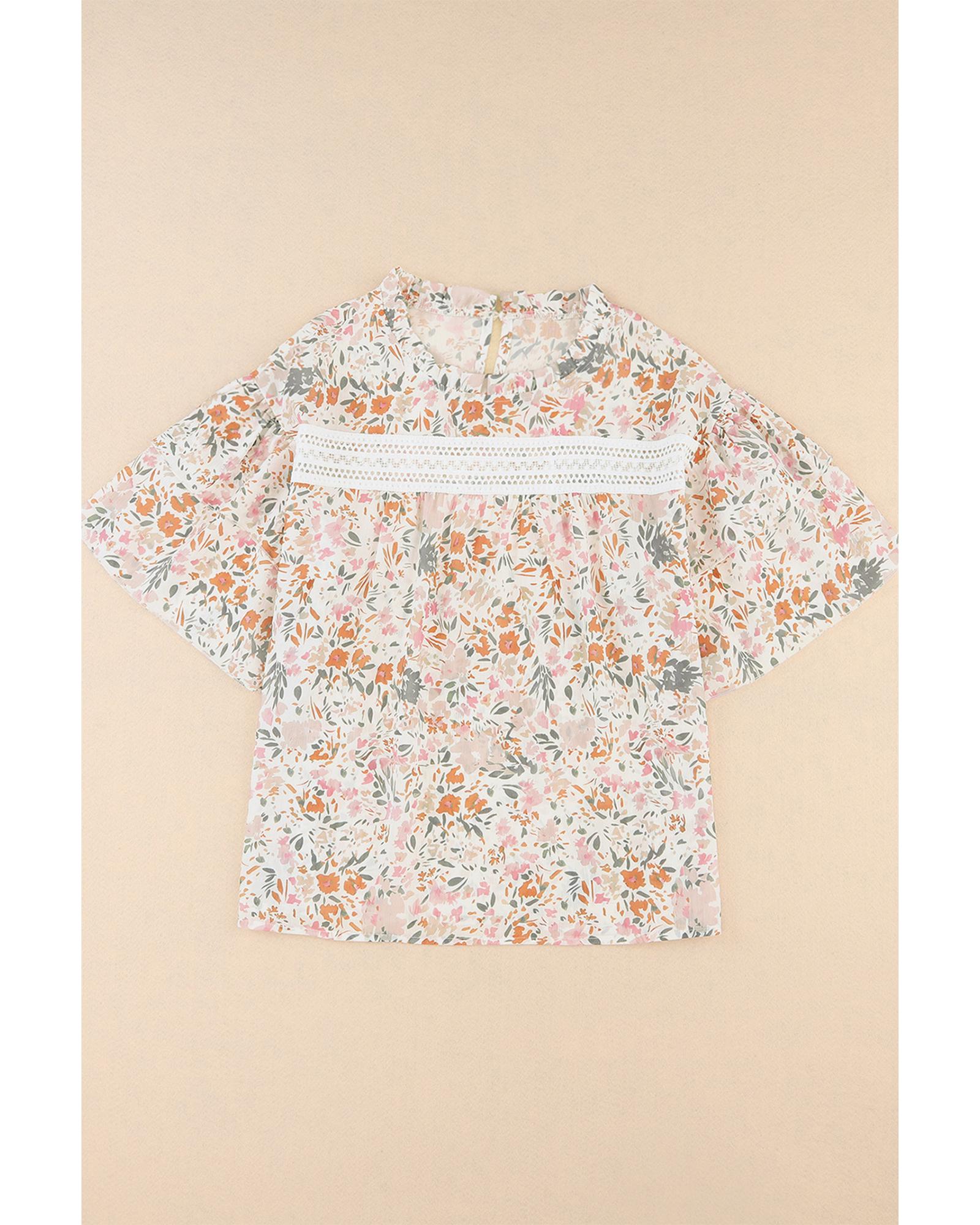 This floral print blouse features wide ruffle sleeves that add volume and movement, making it a stylish choice for women. The vibrant floral pattern enhances femininity and adds a touch of elegance to any outfit. Crafted with attention to detail and quality, it is designed to provide both comfort and style.